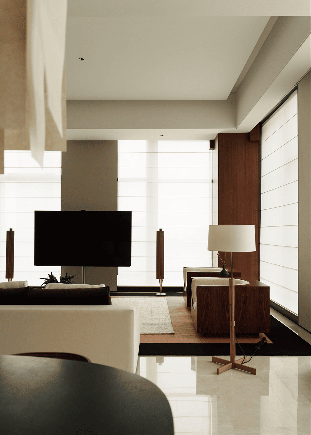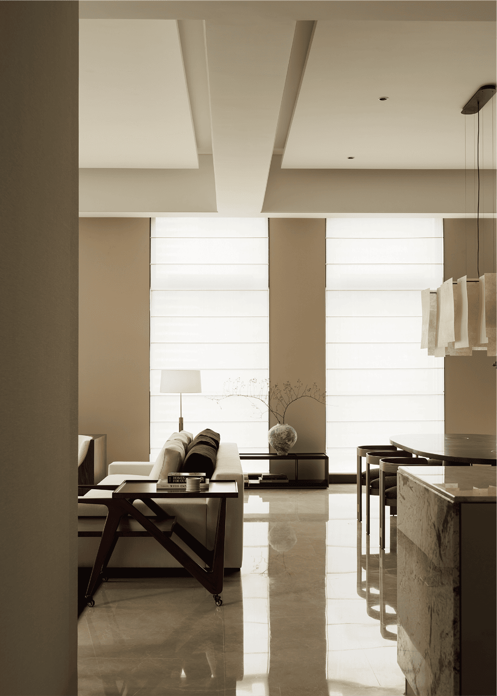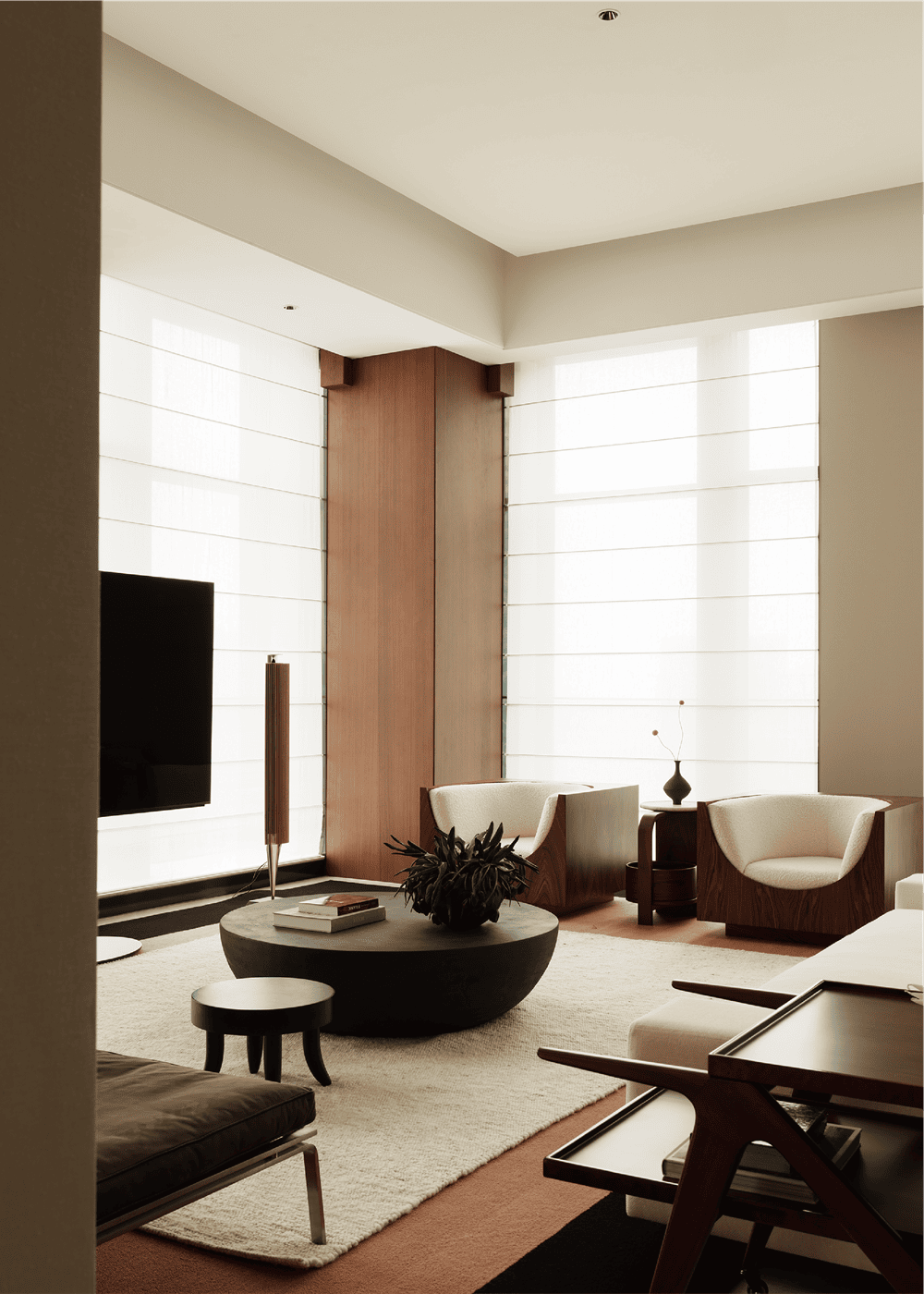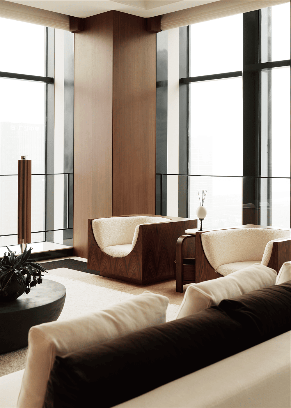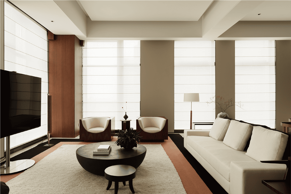 超高层住宅具有极佳的视野和空间感,但空间结构并不是设计团队希望表达的主题,因此设计团队强调简化形式,开放式的家具布局以质感、纹理丰富的软装作为搭配,以中古家具与现代家具相结合,使空间色调与风格协调统一,感官上优雅、低调、舒适、自然。