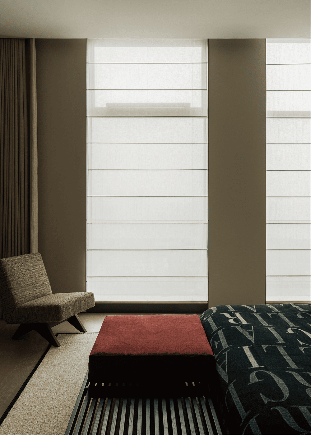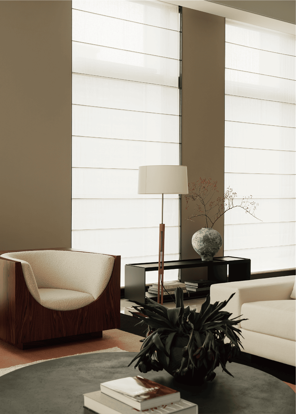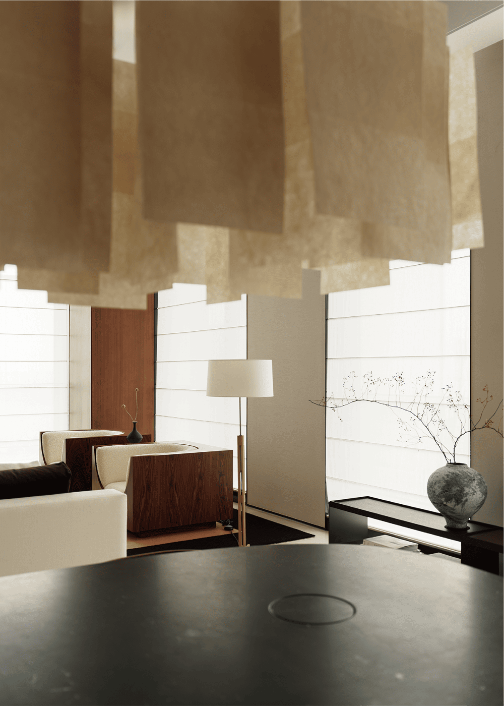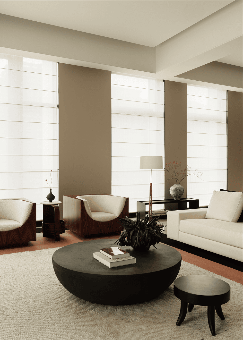 超高层住宅具有极佳的视野和空间感,但空间结构并不是设计团队希望表达的主题,因此设计团队强调简化形式,开放式的家具布局以质感、纹理丰富的软装作为搭配,以中古家具与现代家具相结合,使空间色调与风格协调统一,感官上优雅、低调、舒适、自然。