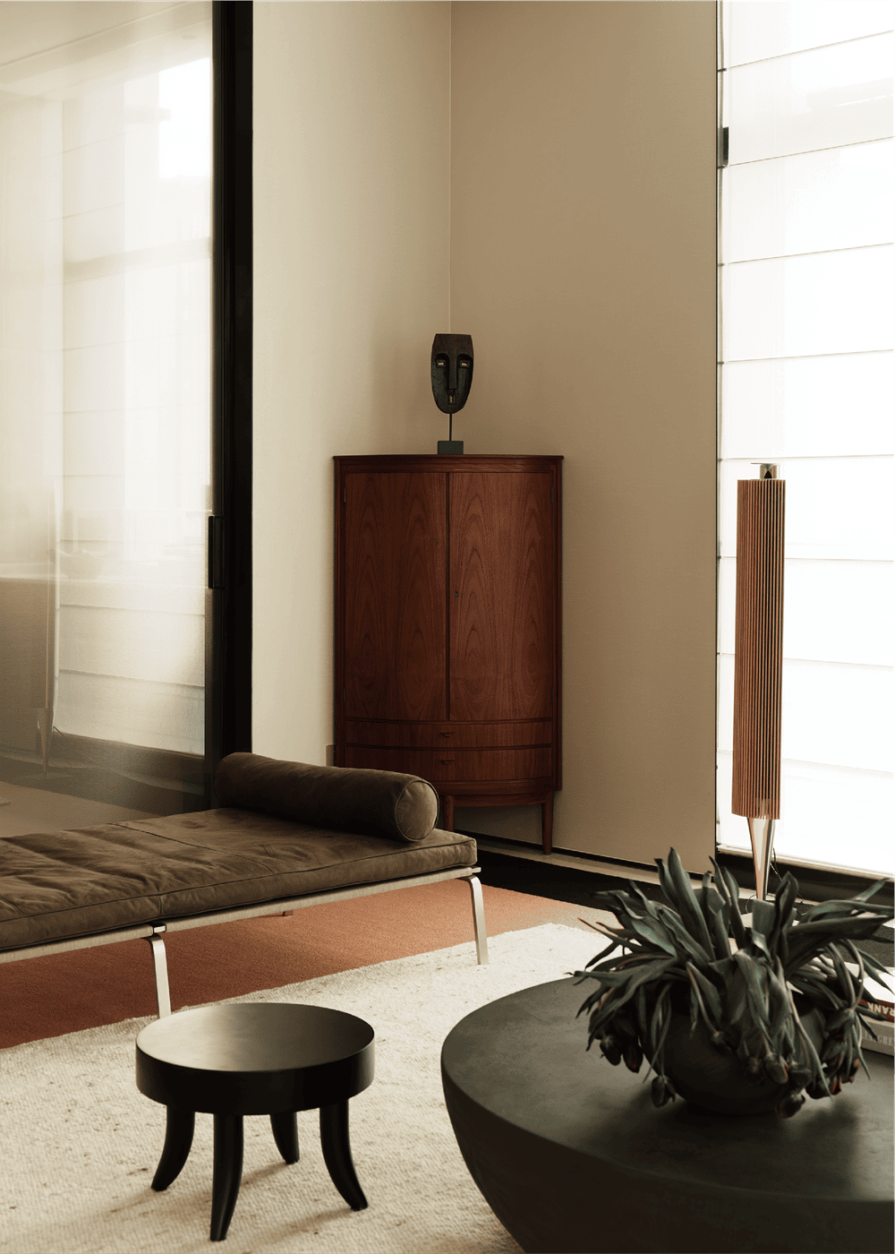 Daybed is from Nor11,Denmark. Nubuck leather and stainless steel also enrich the space materials. The coffee table OBJECTUM is from NORHOR and the teak corner cabinet is from 1960s Nordic antique furniture.