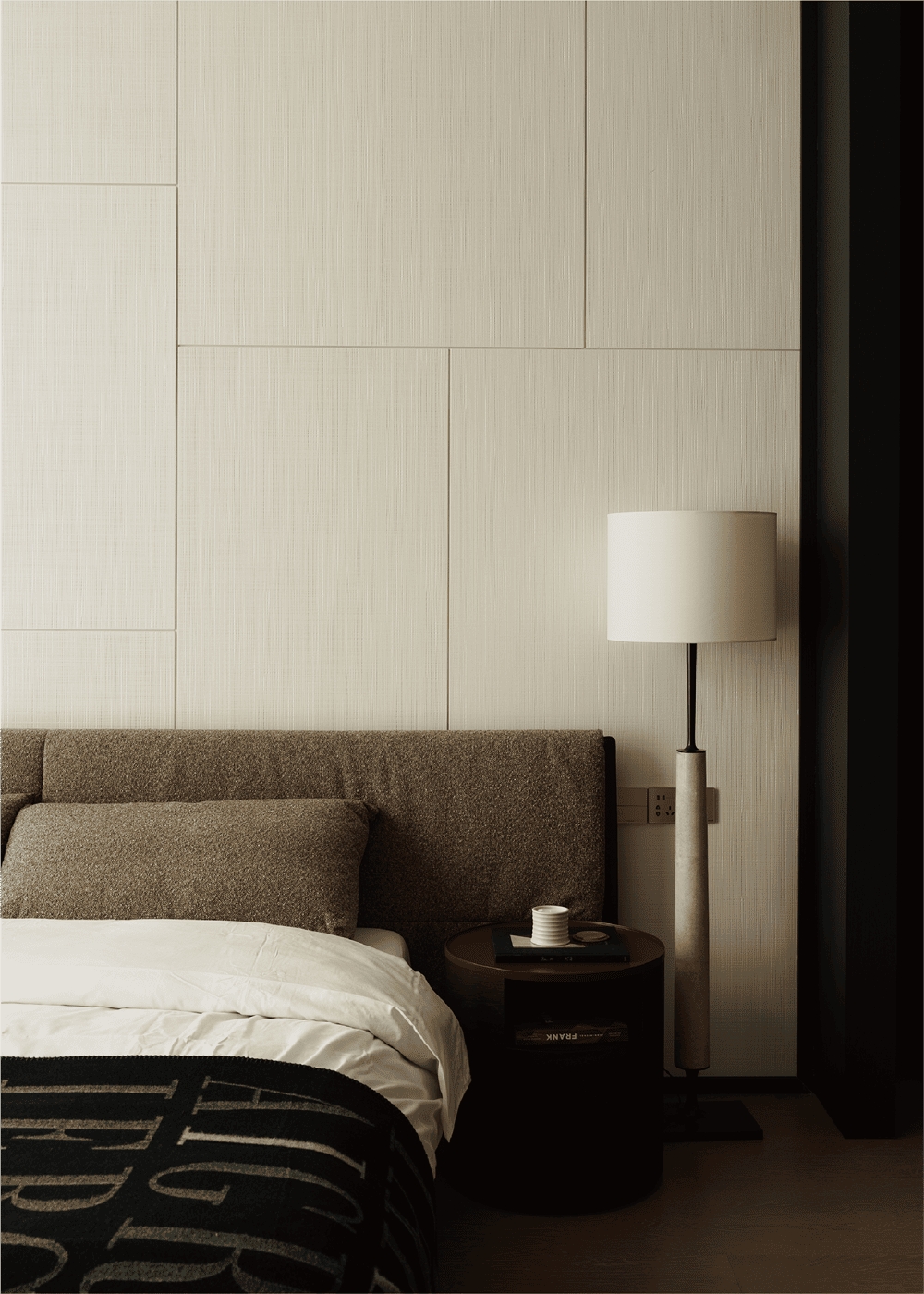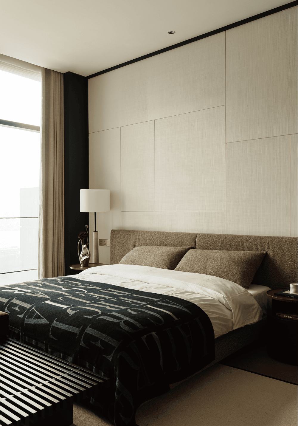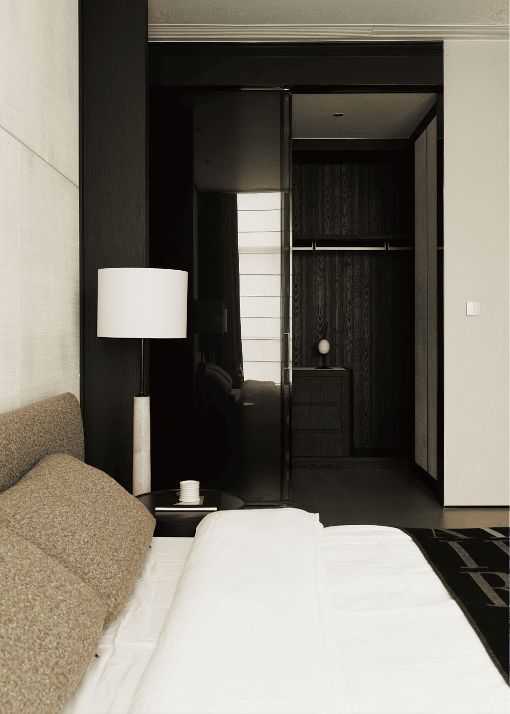 The original background wall of the master bedroom was removed, and the specially treated wood veneer was carved into a delicate texture like wall cloth. The double bed is Poliform's Yume, and the extended bed back creates a sense of warmth and intimacy that surrounds it.