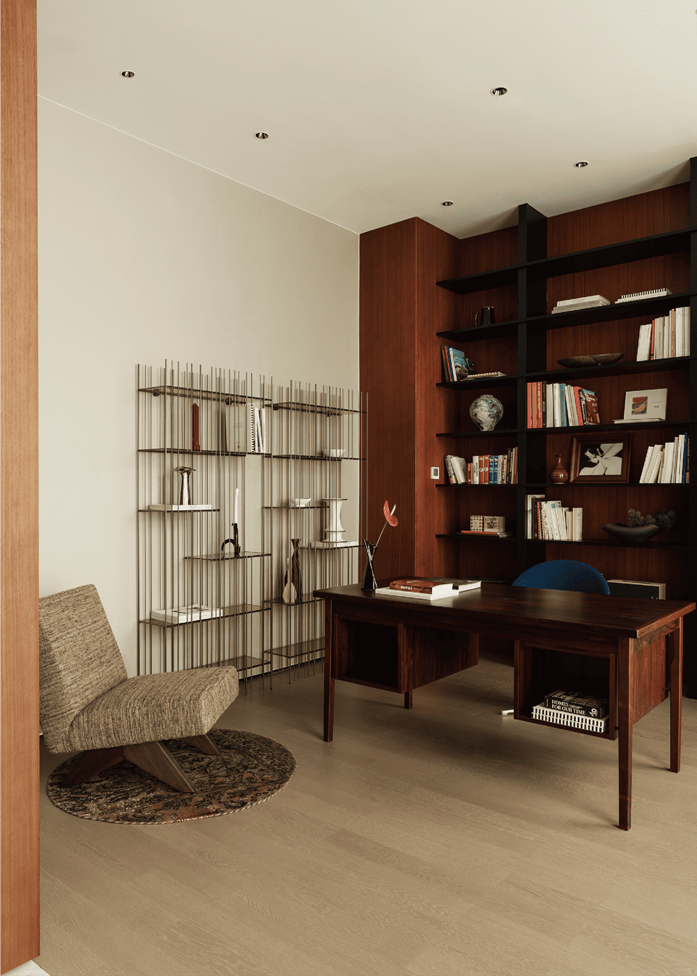 Two sets of Mogg's Metrica bookshelves are inspired by musical scores. They can be used to place books or decorate, and can present different feelings. The antique rosewood desk from the 1960s, can be used functionally both front and back. The blue cone-shaped chair is Verner Panton’s Cone Chair.