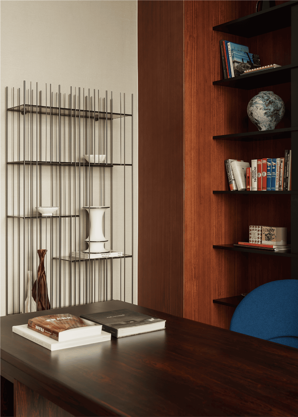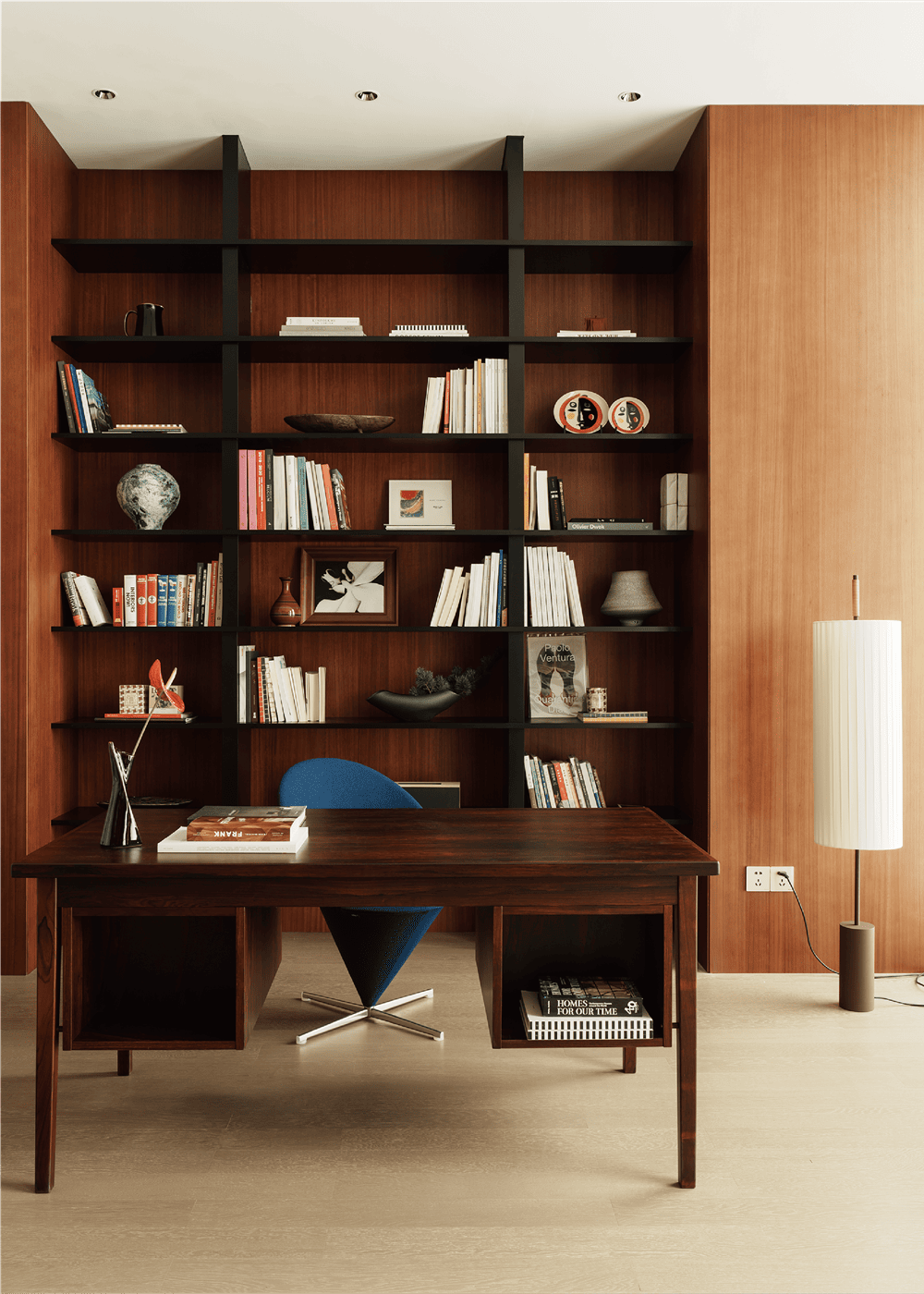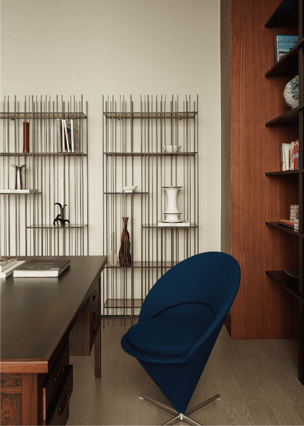 两组Mogg的Metrica书架,灵感来自乐谱,它们既可以用来摆放书籍,也可以用来装饰,呈现出不同的感觉。1960年代的中古黑黄檀木书桌,可前后用作功能使用。蓝色锥形椅是Verner Panton的Cone Chair。