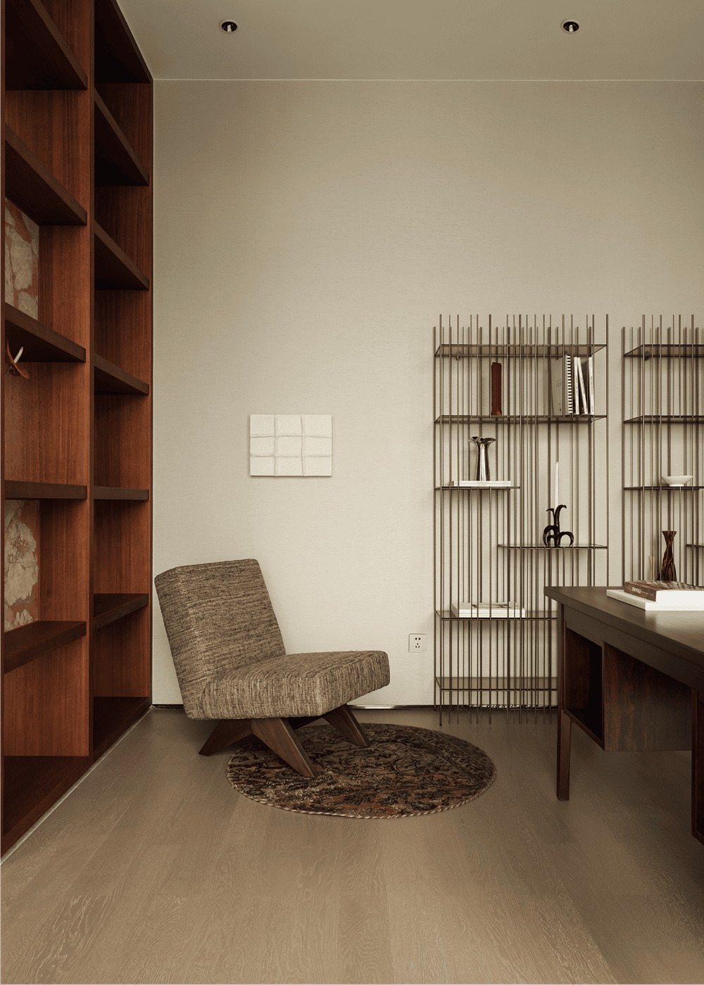 Entering the study space, the hollow bookshelf, which is a combination of wood and stone, serves as a partition into the study. Wrapping the space in bookshelves can bring a more comfortable and relaxed reading experience, allowing the owner to find the joy of life amidst the hustle and bustle, while also enjoying peace in solitude.