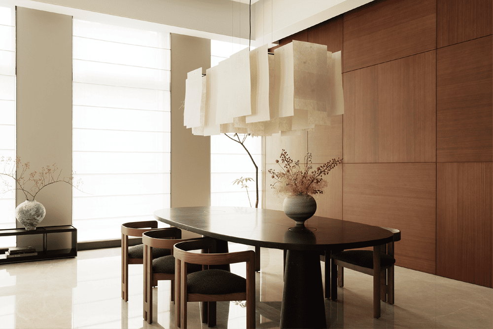Super high-rise residential come with excellent vision and sense of space. But the spatial structure is not the subject we want to express, so we emphasize simplified forms, the furniture layout with rich texture soft furnishings are used as a match, and the antique furniture and modern furniture are combined to make the space tone and style coordinated and elegant, low-key, comfortable and natural.