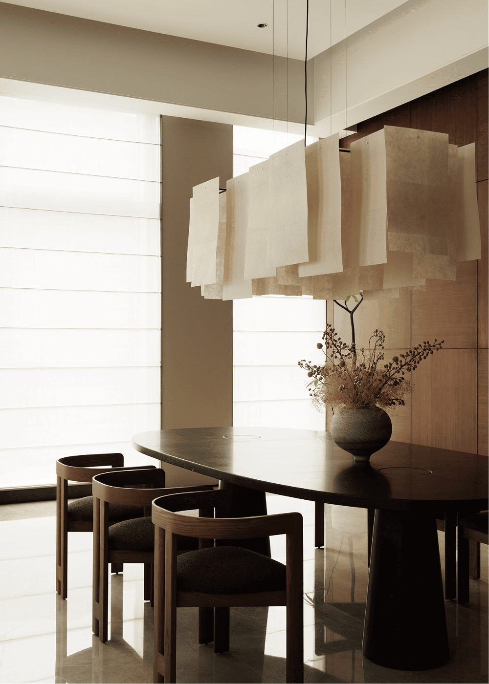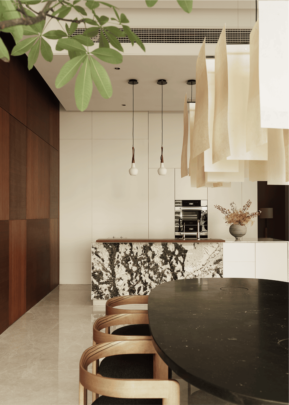 纵横交错的尤加利木纹护墙在餐厅中延续运用,并包含了两扇通往卧室的隐形门,以保持视觉上的一致性。吊灯来自品牌 Pallucco的Alexandra系列,它由交替的薄玻璃纤维板组成,尽管宽度达到1.8米,但依然轻巧灵动。