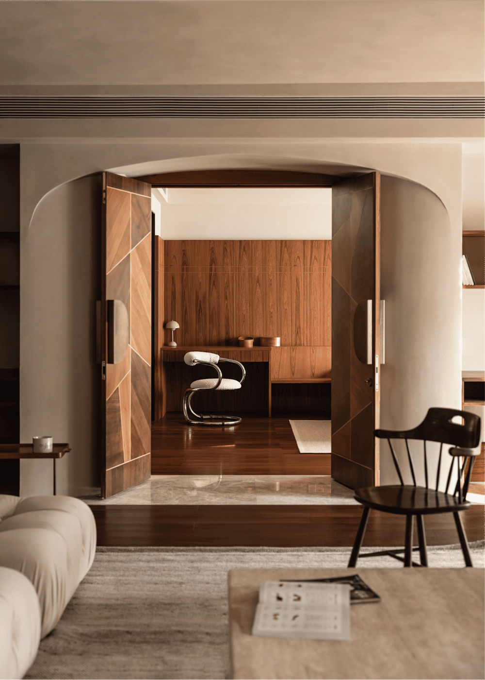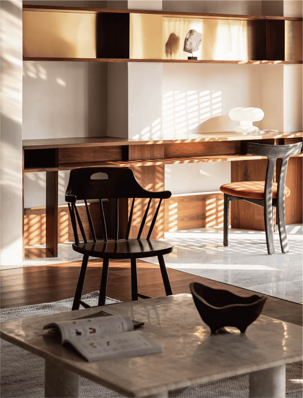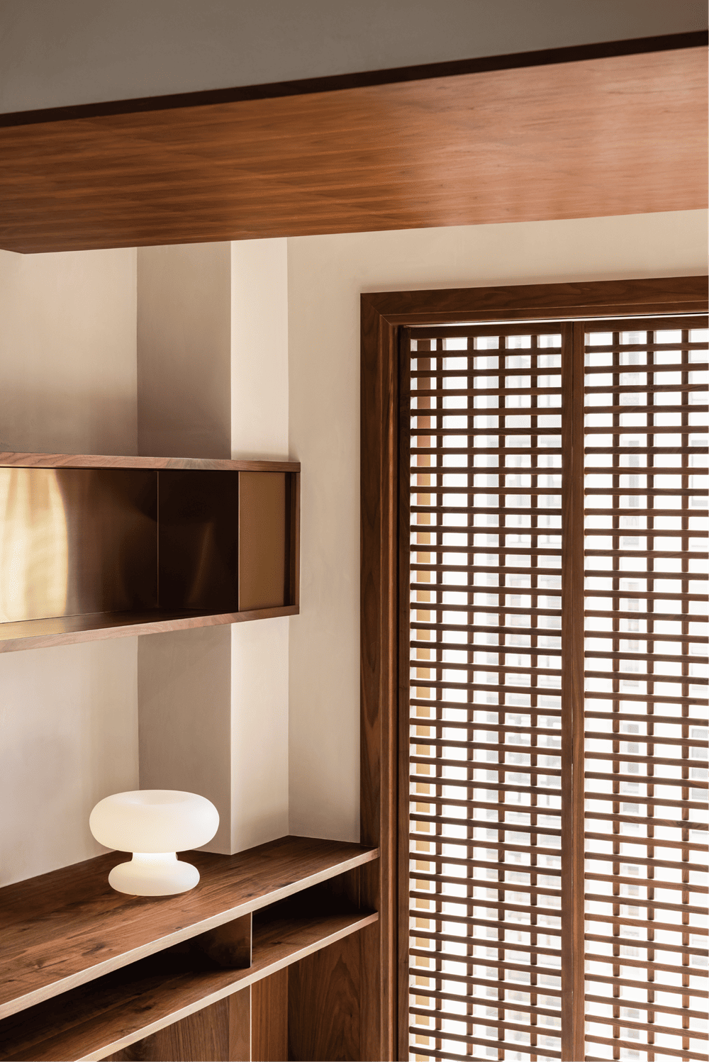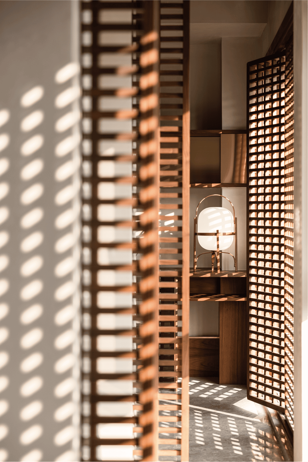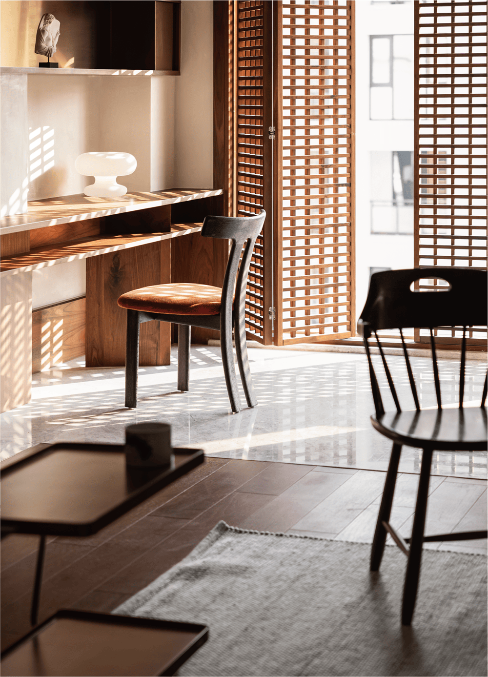 The division of material in the public ground highlights the leisure area and makes a clear separation between the living room and dining room. The added grille at the boundary with the outdoors enables our sight to be separated from the regular buildings. The partition divides the light and shadow, which makes the natural light more interesting in life.