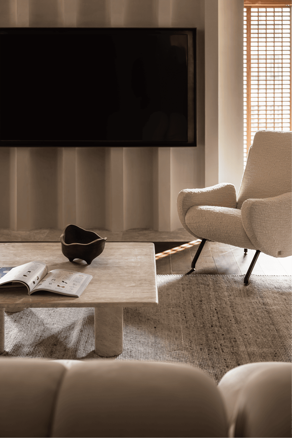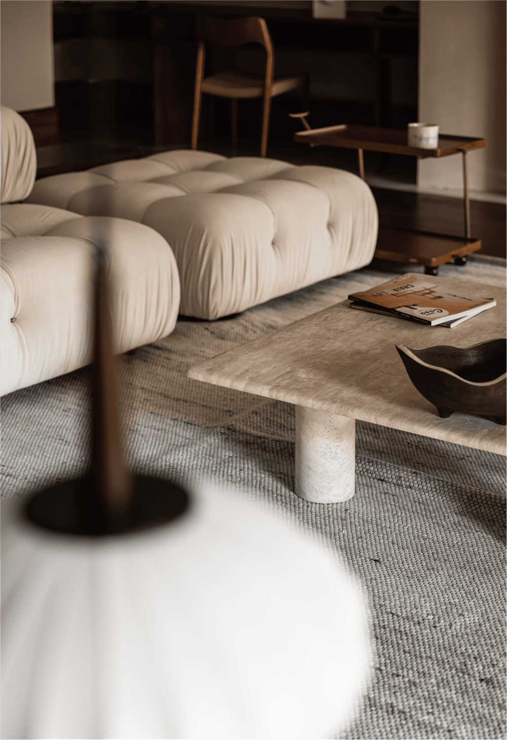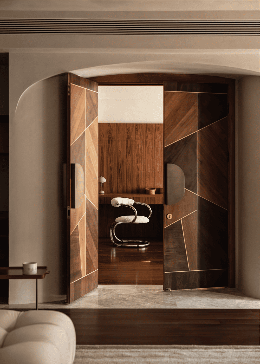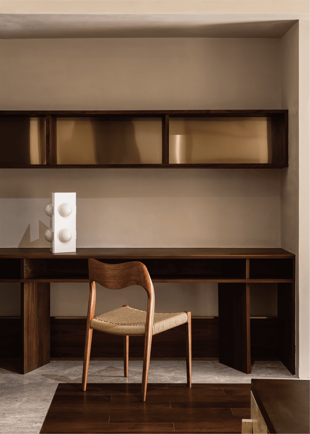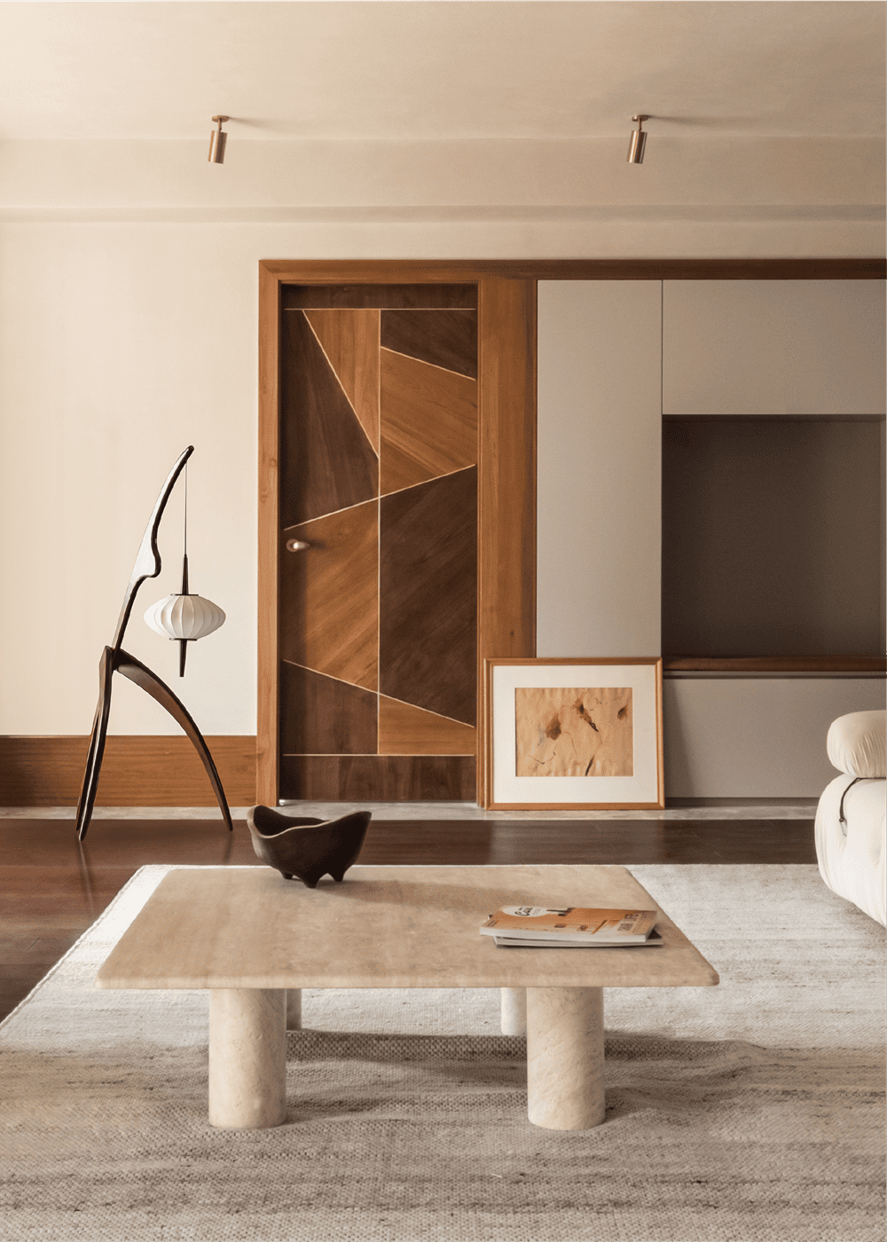 The division of material in the public ground highlights the leisure area and makes a clear separation between the living room and dining room. The added grille at the boundary with the outdoors enables our sight to be separated from the regular buildings. The partition divides the light and shadow, which makes the natural light more interesting in life.