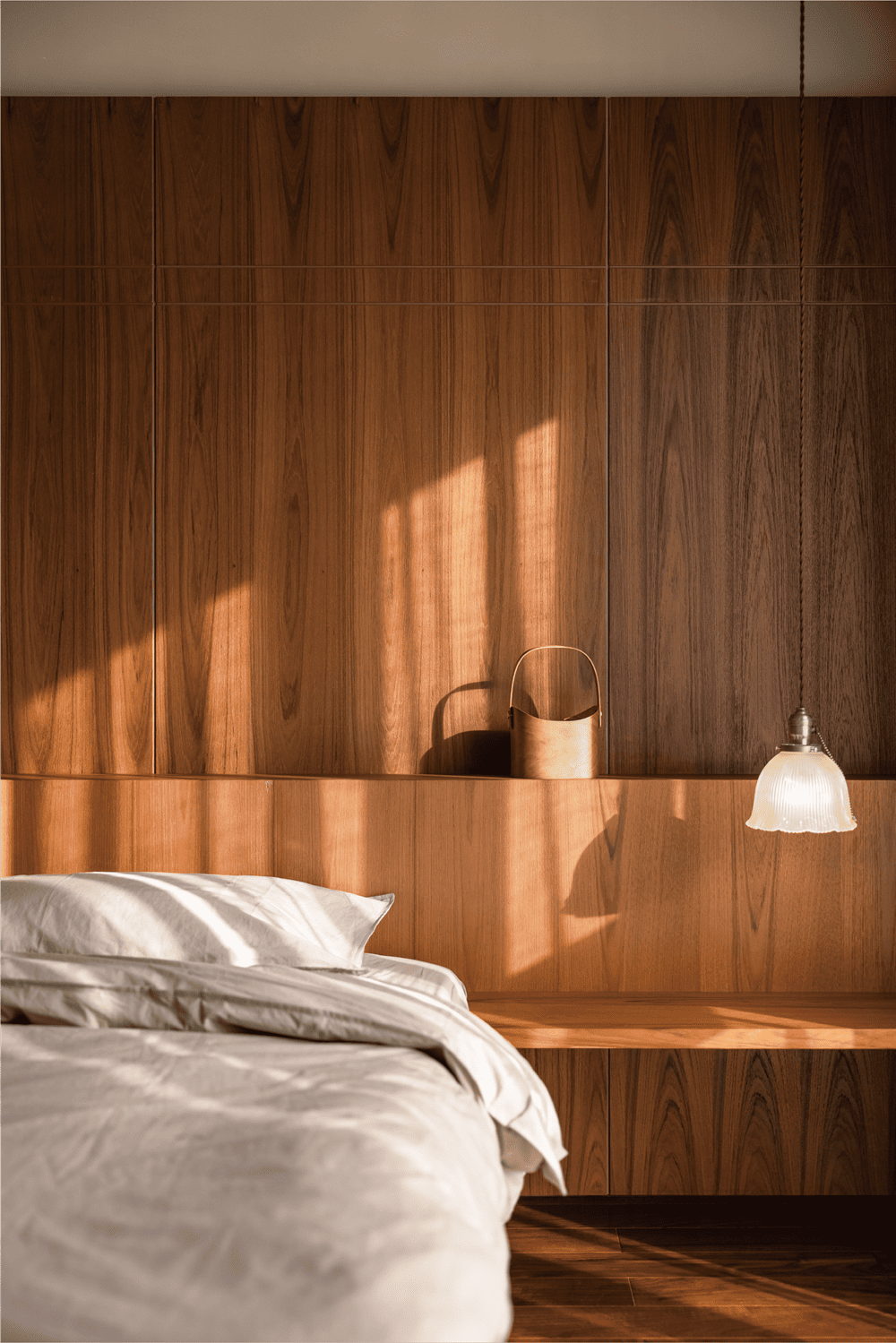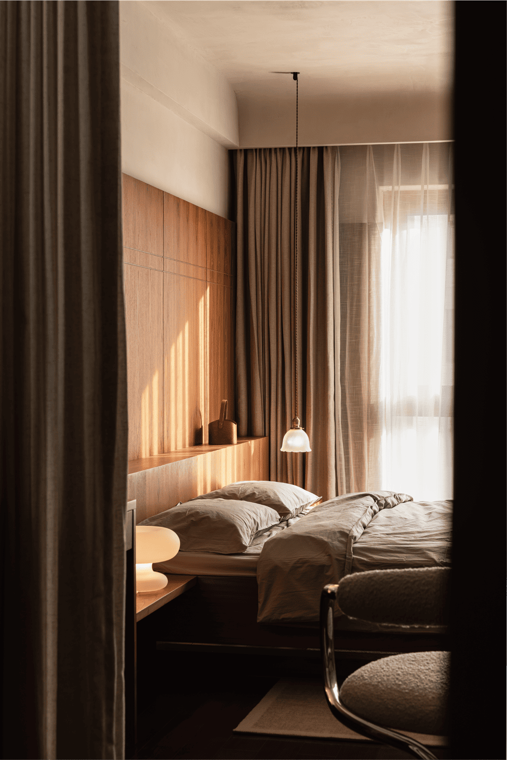 主卧室集休息空间、水吧区域、衣帽间以及卫生间为一体,让居住者日常起居更为便捷。床背板用拼接设计解决了置物梳妆以及照明,我们将卧室功能一体化减少了因功能分散而造成的家具的堆积。