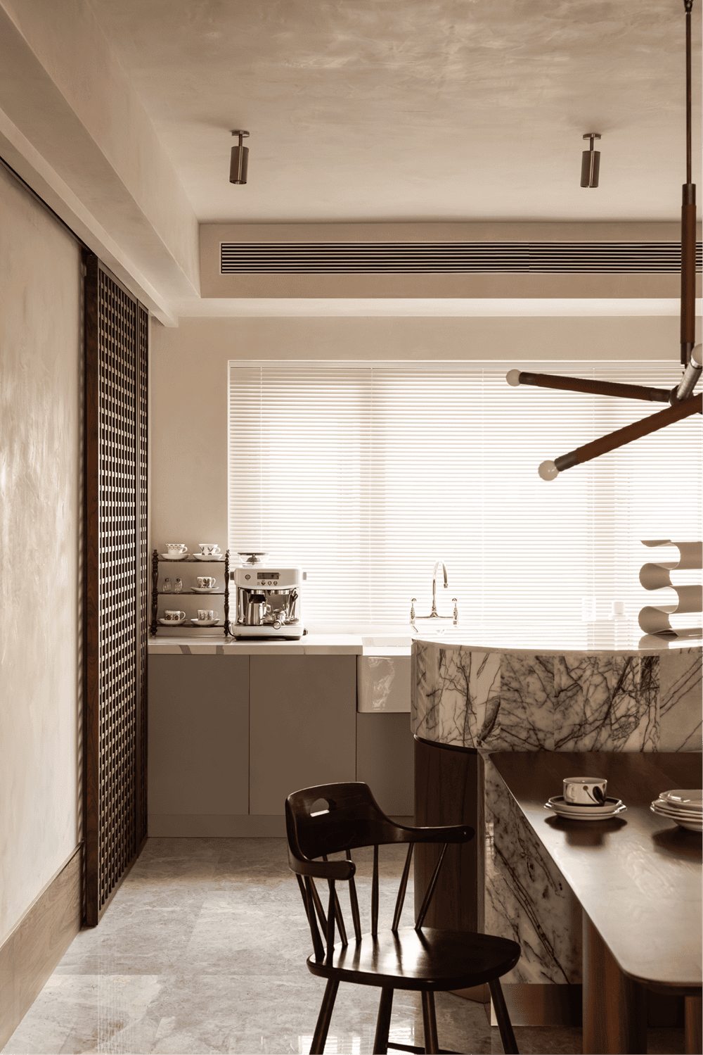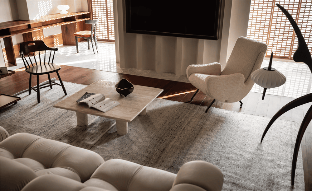 公共区域地面的材质划分突出休闲区域重点的同时也有效的将客餐厅做了分离。与户外分界处格珊的叠加处理让视线可以从规律的楼群中剥离开,利用隔断切分光影,让自然光线多点生活趣味。