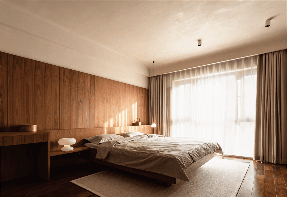 The master bedroom integrates the resting space, the water bar area, the closet, and the bathroom, which makes the daily life of residents more convenient. The back panel of the bed used the design of splicing which provides the place for dressing and lighting. We also integrate the bedroom functions to reduce the accumulation of furniture which is caused by scattered functions.