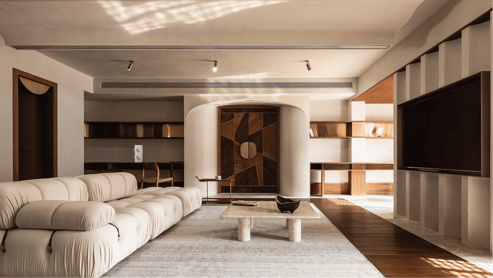 在此项目中我们理性分析委托人的实际需求,再合理划分各区域空间面积。整体动线以客厅为主体向四周扩散。日常生活中客厅是家人情感交流的重要枢纽,也是家庭成员停留时间最多的地方,我们在设计上尽可能的将此空间最大化。