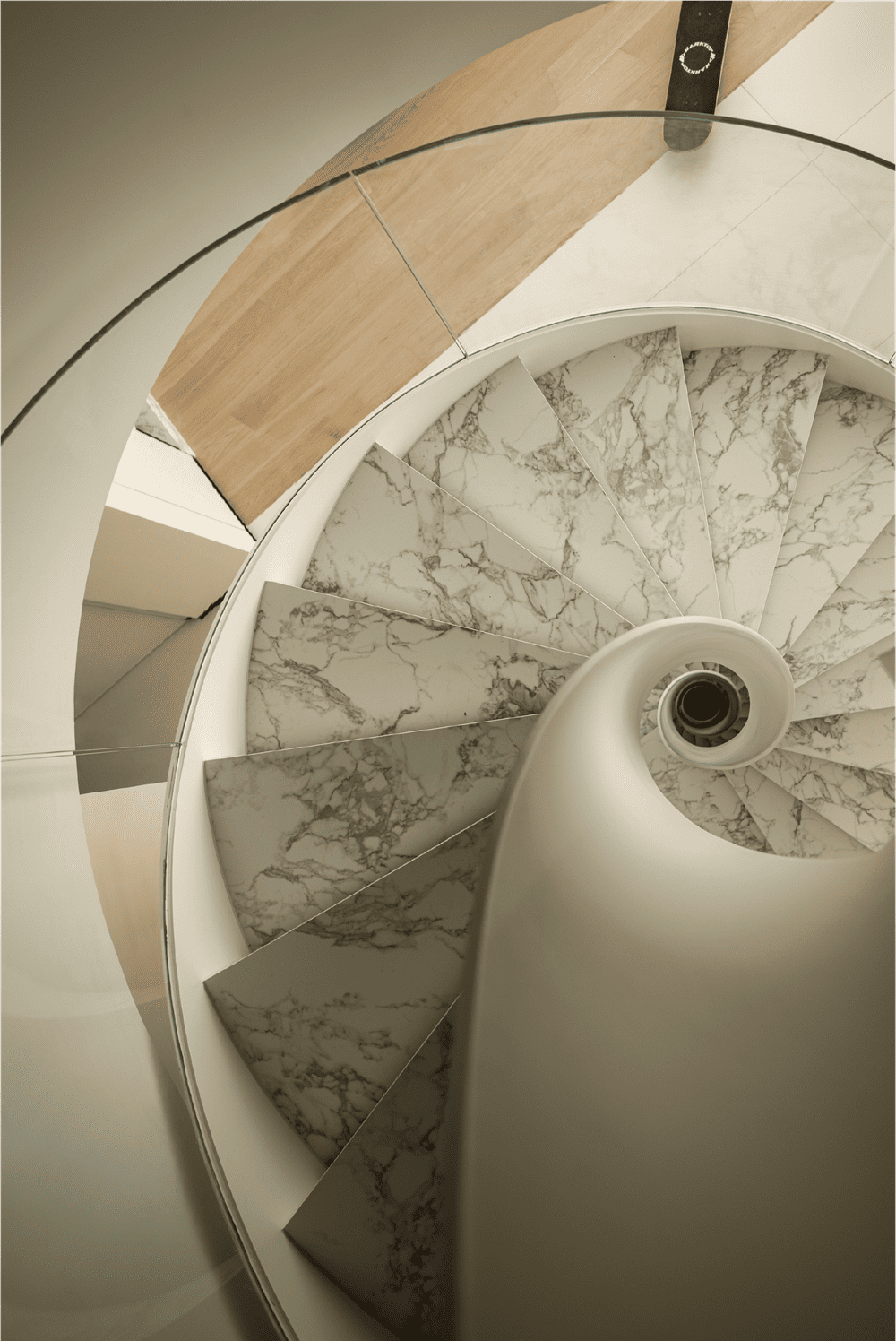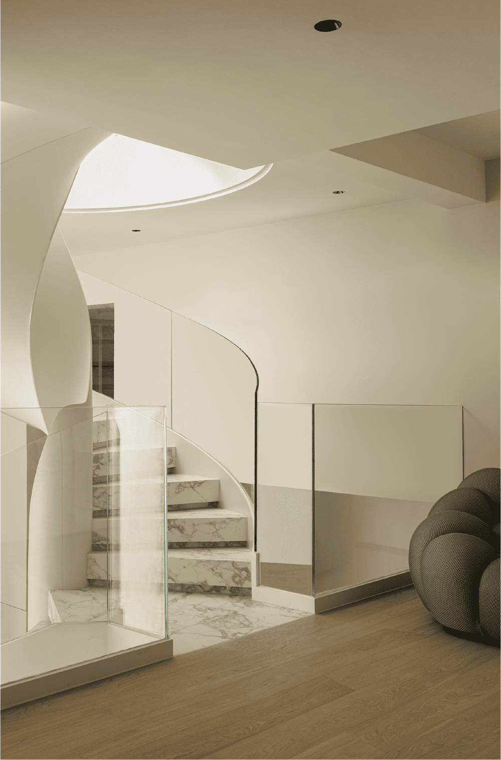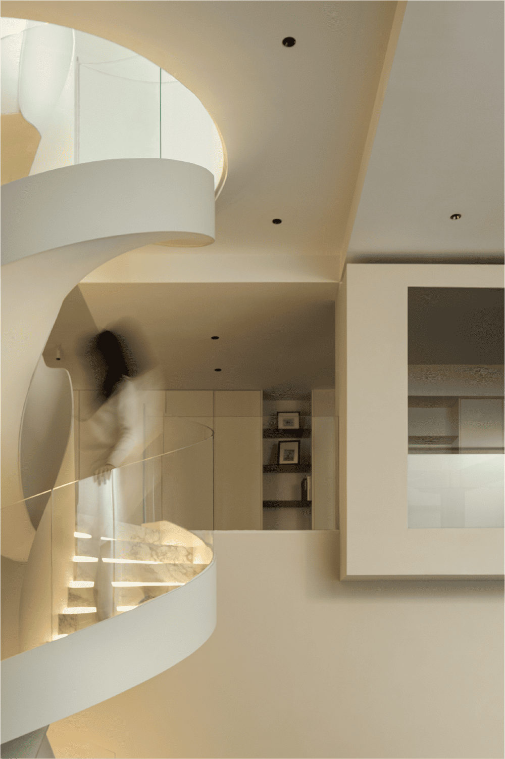 The glass handrail gives a dreamy feeling, and the space on the first floor of the staircase creates a sense of heavenly light in this location. The second basement level is the owner's office and leisure area, while the office can also overlook the leisure space on the ground floor through the window view of the box, creating a nice spatial counterpoint.