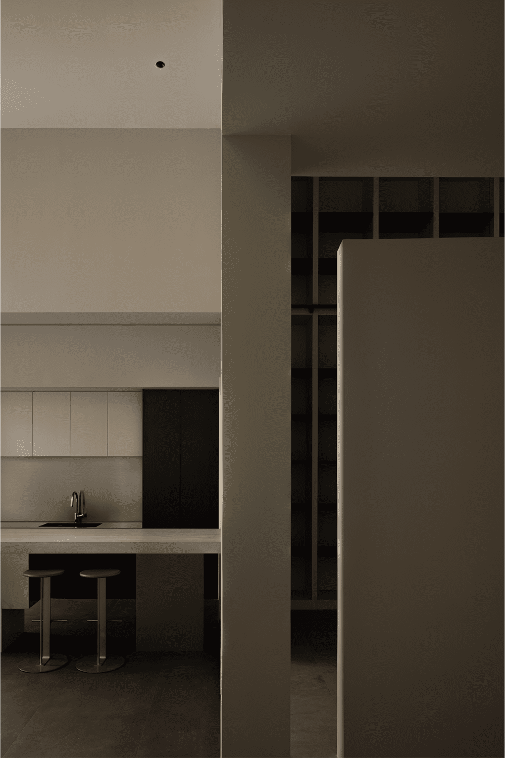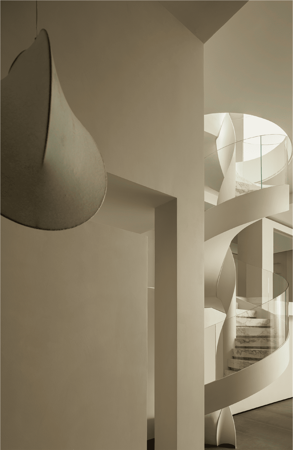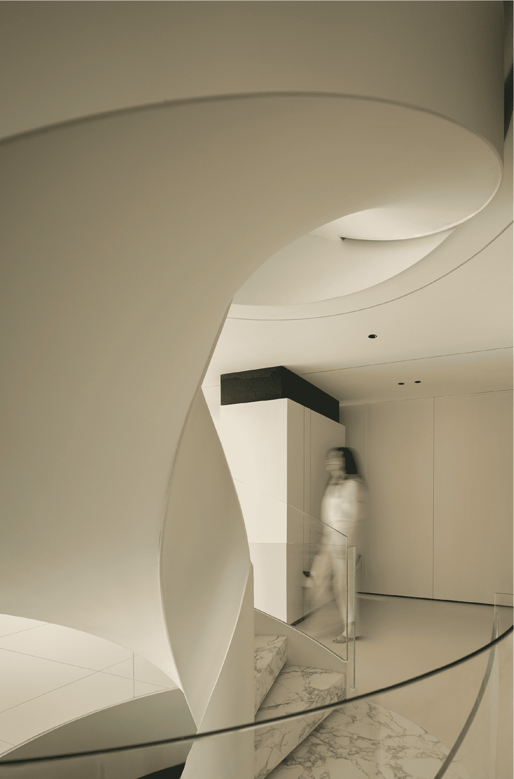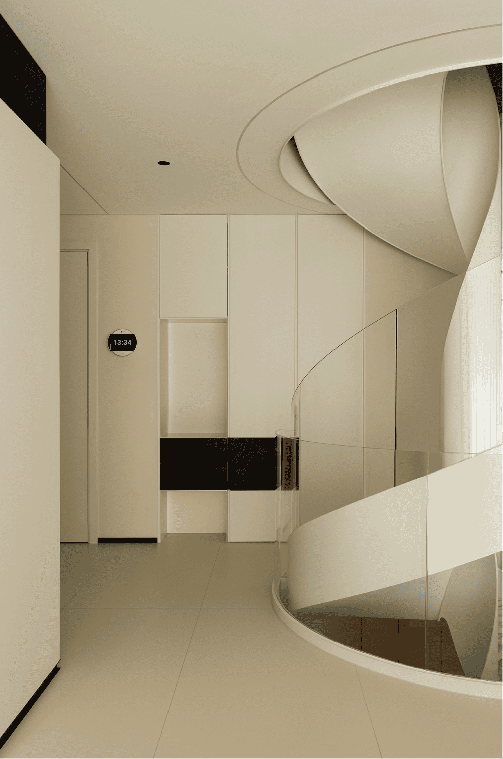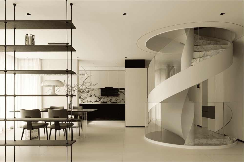 左侧是一个流动的旋转楼梯,右侧是一个有趣的玻璃盒子。底层是娱乐空间,朋友们来时可以在吧台喝上几杯,非常惬意。空间内也设置了儿童游乐空间,在这里,空间内的每个人都可以在各个区域单独活动。简洁的黑白色调、干净的材质在空间中相得益彰。不锈钢台面和洞石岩板使空间更加简洁。空间是需要通过高低层次来体现的。空间层次可以使居住者的内心发生变化,在空间中过渡 —— 心理变化的产生、体量的大小,都与设计规划密不可分。地下空间呈现出室内光影变化的层次效果,白墙的力量在于其纯净、明亮的特性,为整个空间带来清新、开放的氛围。白色的墙壁成为光线的引导者,将自然光引入每个角落,营造出宁静、开放的生活环境。