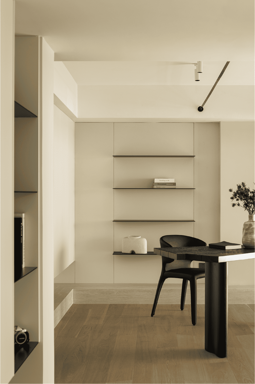 入口区域的黑色盒子再次延伸到鞋柜的空间,两者可以更好地呼应,同时也通过视线转移向功能区过渡。楼梯的流线在整个空间中尤为突出,它既是一个隔断,又是各个空间之间的联系纽带。
