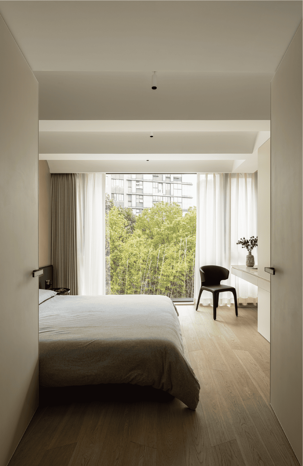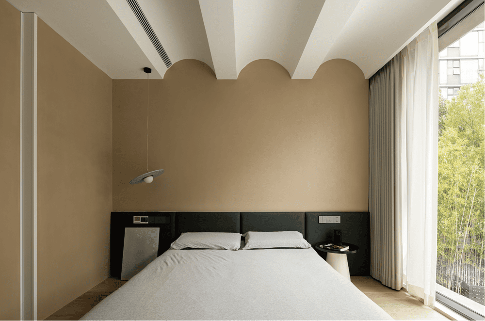 极简主义衍生万千气象。主卧延续了典雅简约、温馨舒适的品质外,充足温暖的光线、细腻平和的软装织品,都呈现出轻松、静谧、平和的氛围,让人与环境产生共鸣,找到内心的从容。生活的质感从来不来自矫揉造作,而是来自享受更加随心、随性的生活。有趣的天花板设计与孩子天马行空的思维不谋而合,左侧的行星灯也是孩子们执意想要的小物件。