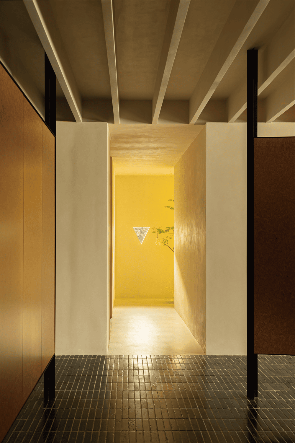 The entrance faces the windows of the building. There is good greenery outside the windows, but it is also mixed with many chaotic buildings, creating a visually cluttered environment. We use the height of people's line of sight, and in form, we use geometric elements to fix the viewer's first-line sight on the green landscape outside the window. At the same time, we use geometric elements on the ground to guide and form a response, seeking a sense of ceremony when entering the venue.