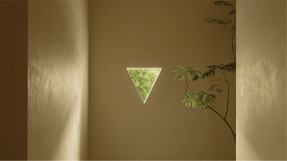 空间入口正对着建筑的窗户,窗外虽有较好的绿化,但也夹杂着较繁华的建筑,视觉上比较混乱。设计团队利用人的视觉高度,以几何元素的形式,将人第一眼的视角定格在窗外的绿化景观上,同时与地面的几何元素指引牌配合,形成呼应,追求进入场馆的仪式感。