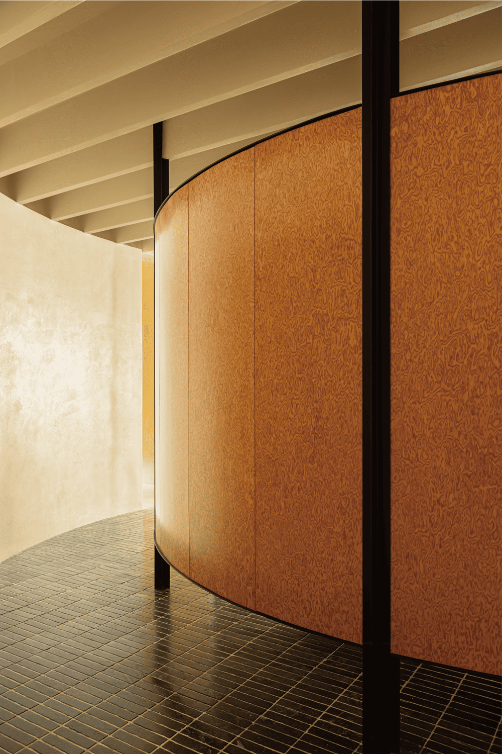 材质上,采取质朴材料为主,在划分的圆形上选择了颜色较为鲜艳的木饰面,一方面为了引导动线走向,另一方面为整个空间提供一个新鲜有趣的色彩感受。在顶面和地面上使用重复的线条方式,而墙面的处理上更为干净,我们希望通过张弛有度的表达,寻找到“呼与吸”的终极钥匙。