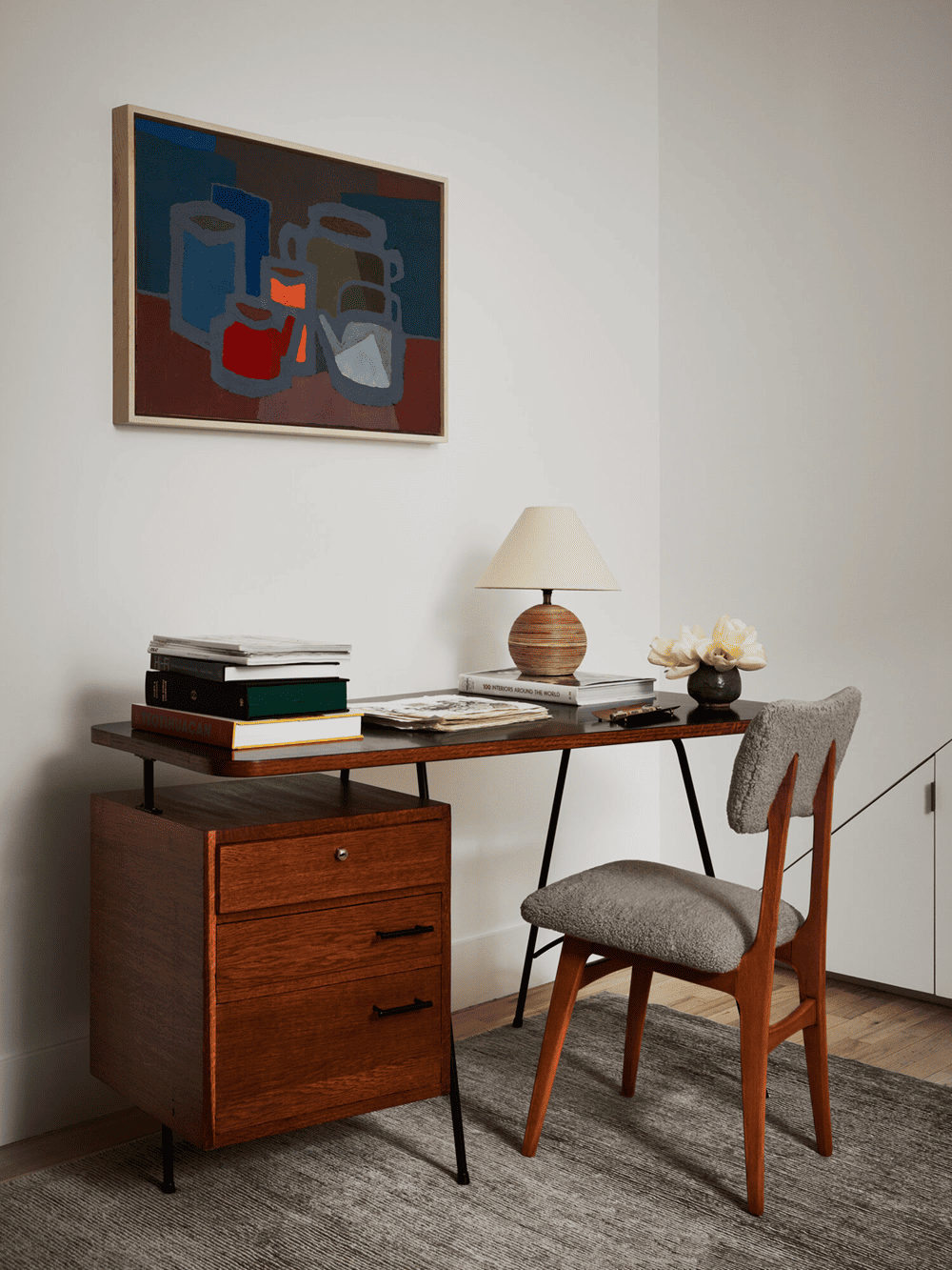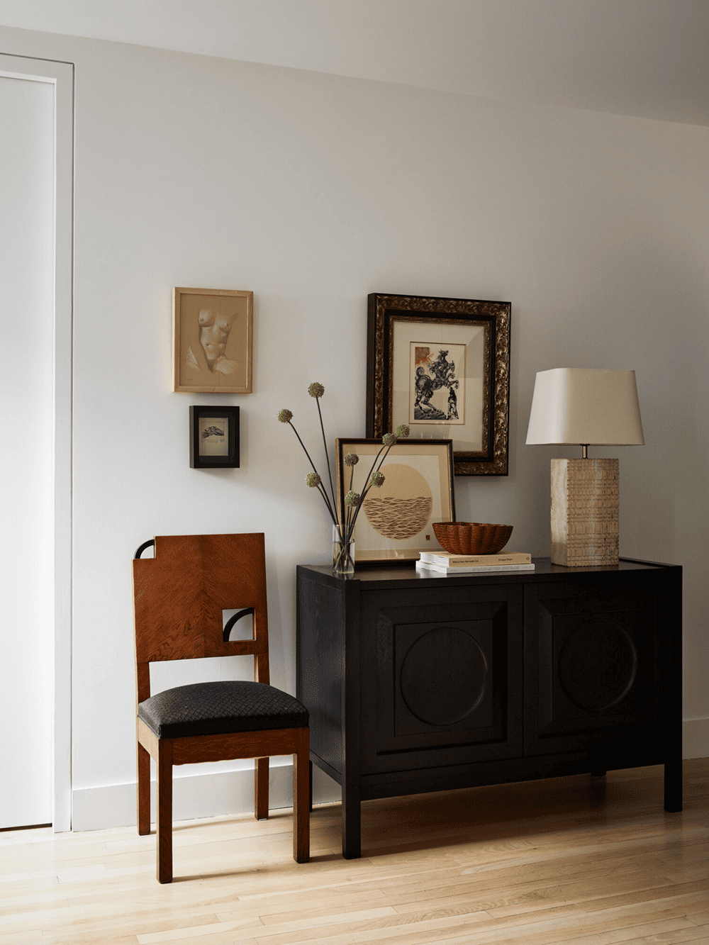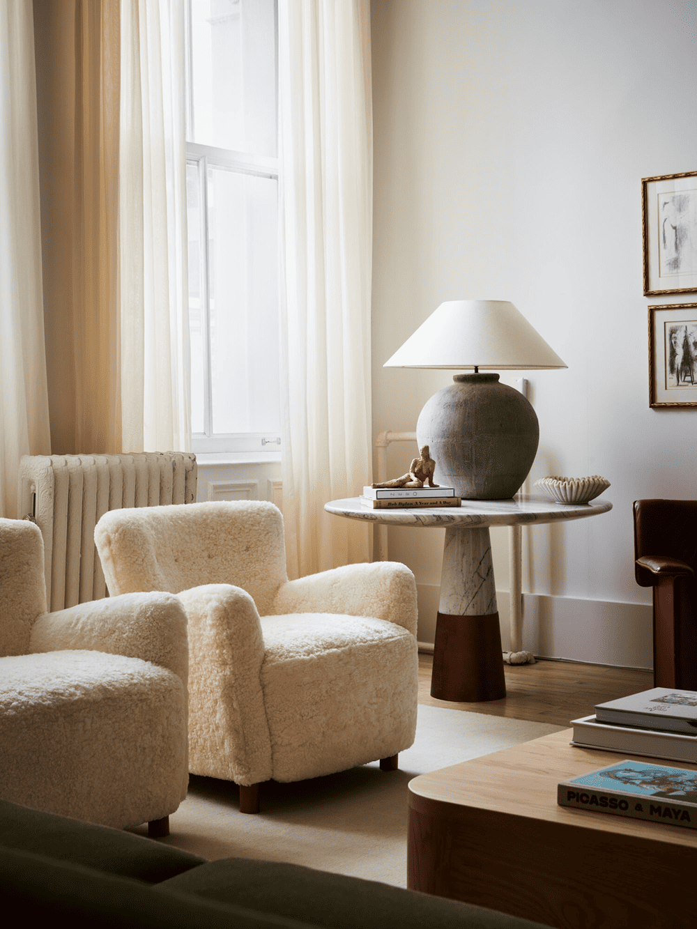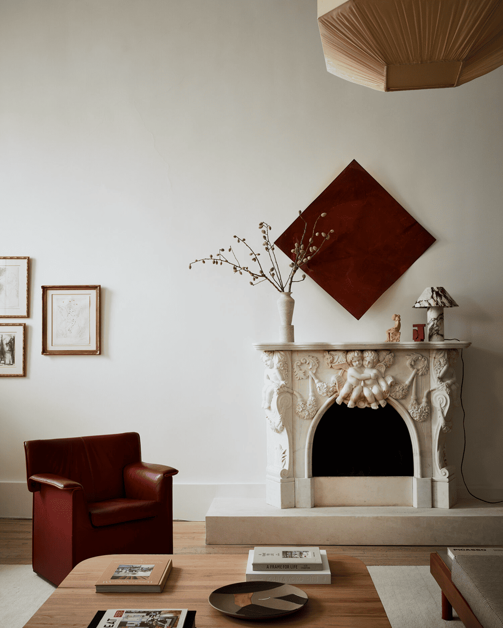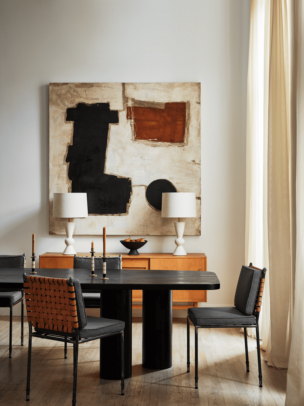 Nicholas Obeid talks about ‘combinations with heart’, here including one-of-a-kind vintage pieces and works of art. In the living room space, he brought fluidity to the layout with soft curves, such as the folding screen by Alvar Aalto in the corner and the red leather chairs by Tobia and Afra Scarpa for B&B Italia.Nicholas Obeid added the work of Brooklyn potter Natalie Weinberger and sculptor Paul Morehouse, who made the sculptures on the fireplace mantel. Meanwhile, the clients brought in some of their own work, including Picasso's lithographs seen in the living room.
