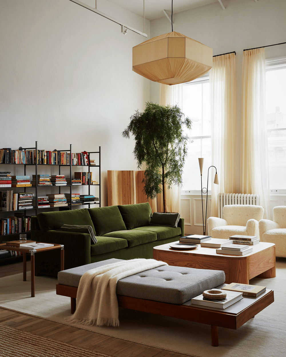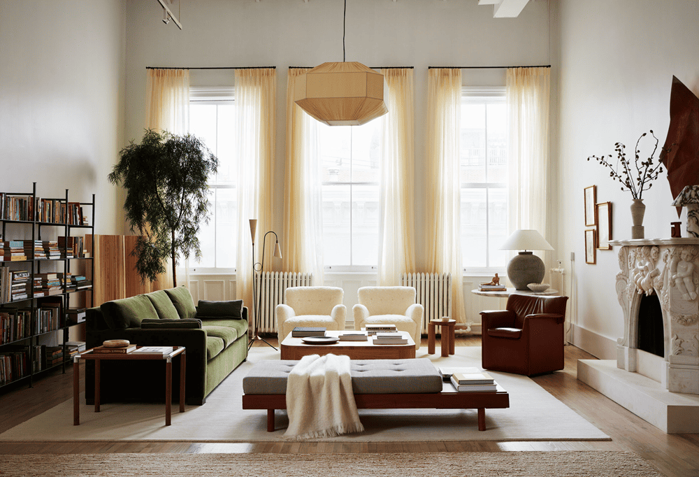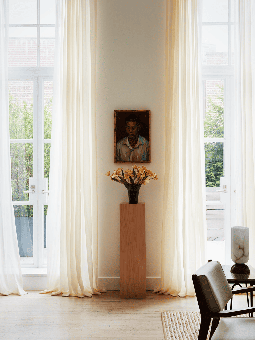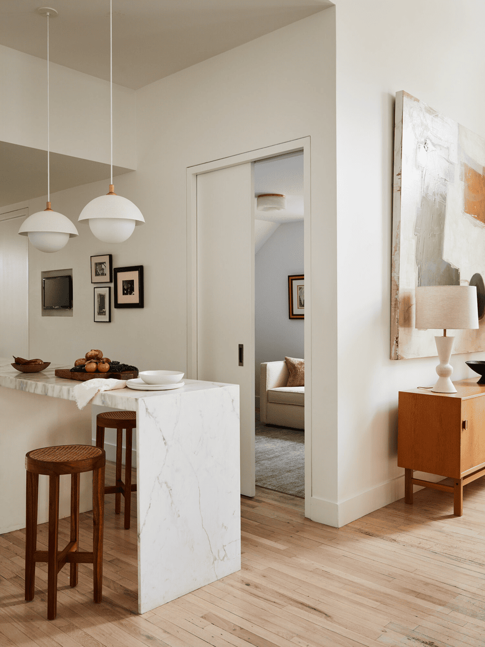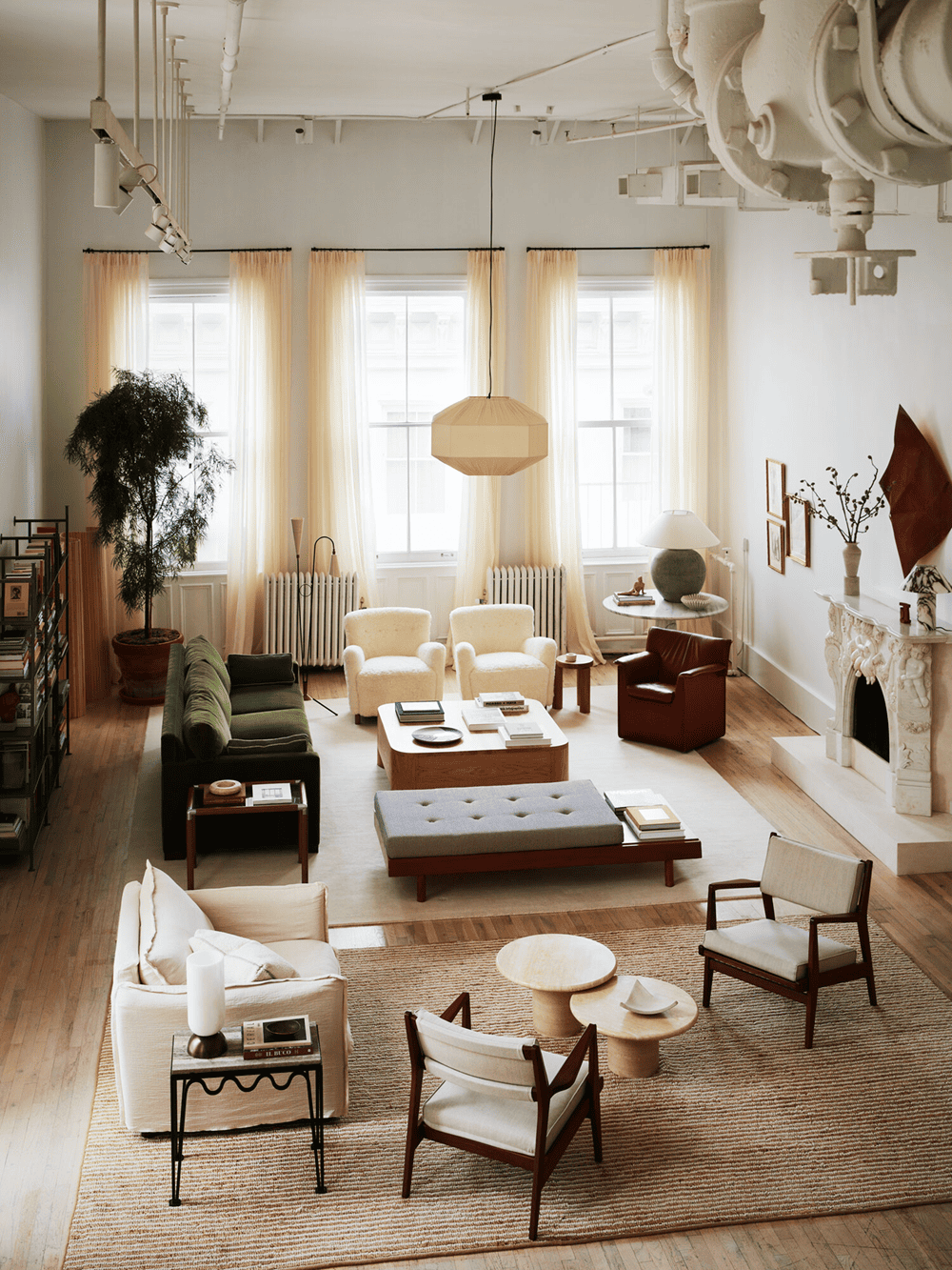 Nicholas Obeid talks about ‘combinations with heart’, here including one-of-a-kind vintage pieces and works of art. In the living room space, he brought fluidity to the layout with soft curves, such as the folding screen by Alvar Aalto in the corner and the red leather chairs by Tobia and Afra Scarpa for B&B Italia.Nicholas Obeid added the work of Brooklyn potter Natalie Weinberger and sculptor Paul Morehouse, who made the sculptures on the fireplace mantel. Meanwhile, the clients brought in some of their own work, including Picasso's lithographs seen in the living room.