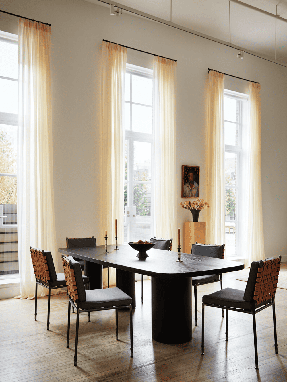 同样的策略也适用于餐饮空间,它的特点是引人注目的落地窗。Nicholas Obeid设计的定制熏黑橡木餐桌以其巨大的尺寸成为房间的支柱。Nicholas Obeid说:“它给人的感觉是有机的,有点柔软和弯曲”。一套皮革编织的Casamidy餐椅为整个空间增添了轻盈感,而且作为惊喜,这些餐椅是在客户结婚的墨西哥小镇上制造的。