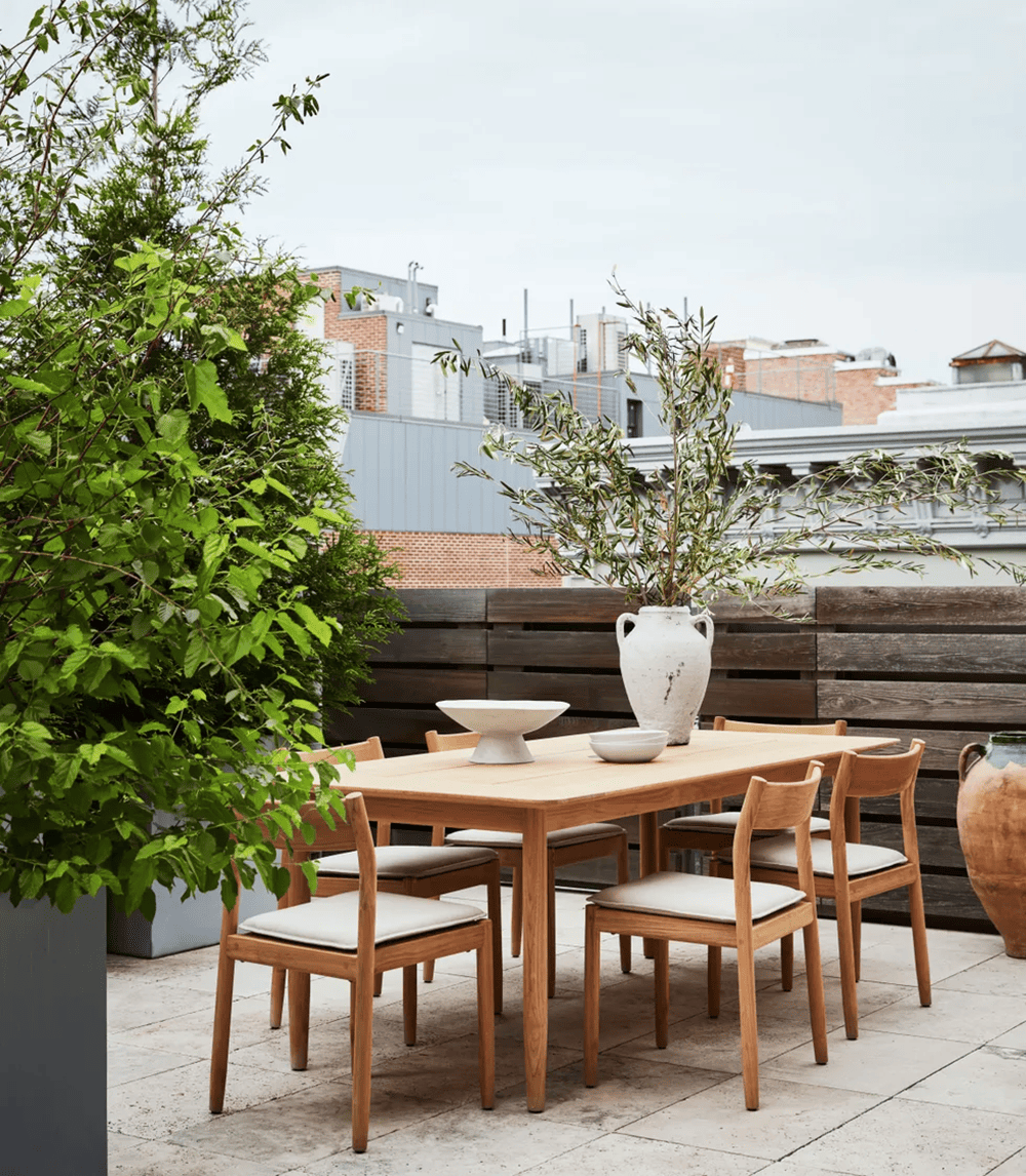 The same strategy applies to the dining space, which features striking floor-to-ceiling windows.The bespoke smoked oak dining table designed by Nicholas Obeid anchors the room with its massive dimensions.Nicholas Obeid says: ‘It feels organic, a little soft and curvy’. A set of leather-woven Casamidy dining chairs add lightness to the space, and as a surprise, they were made in the Mexican town where the client got married.