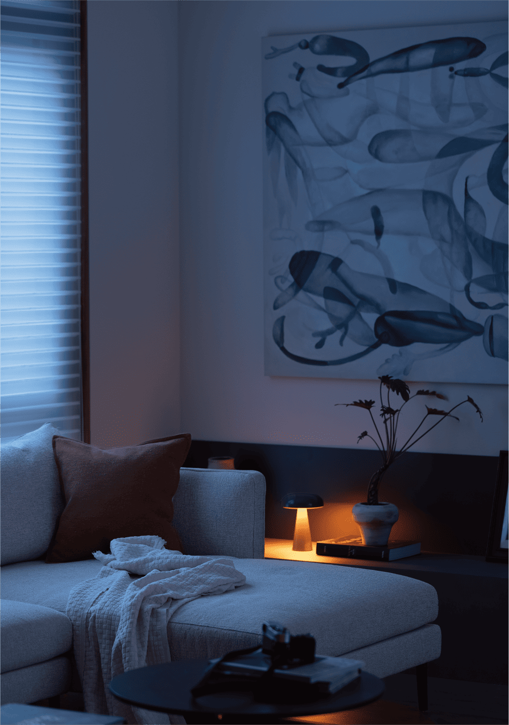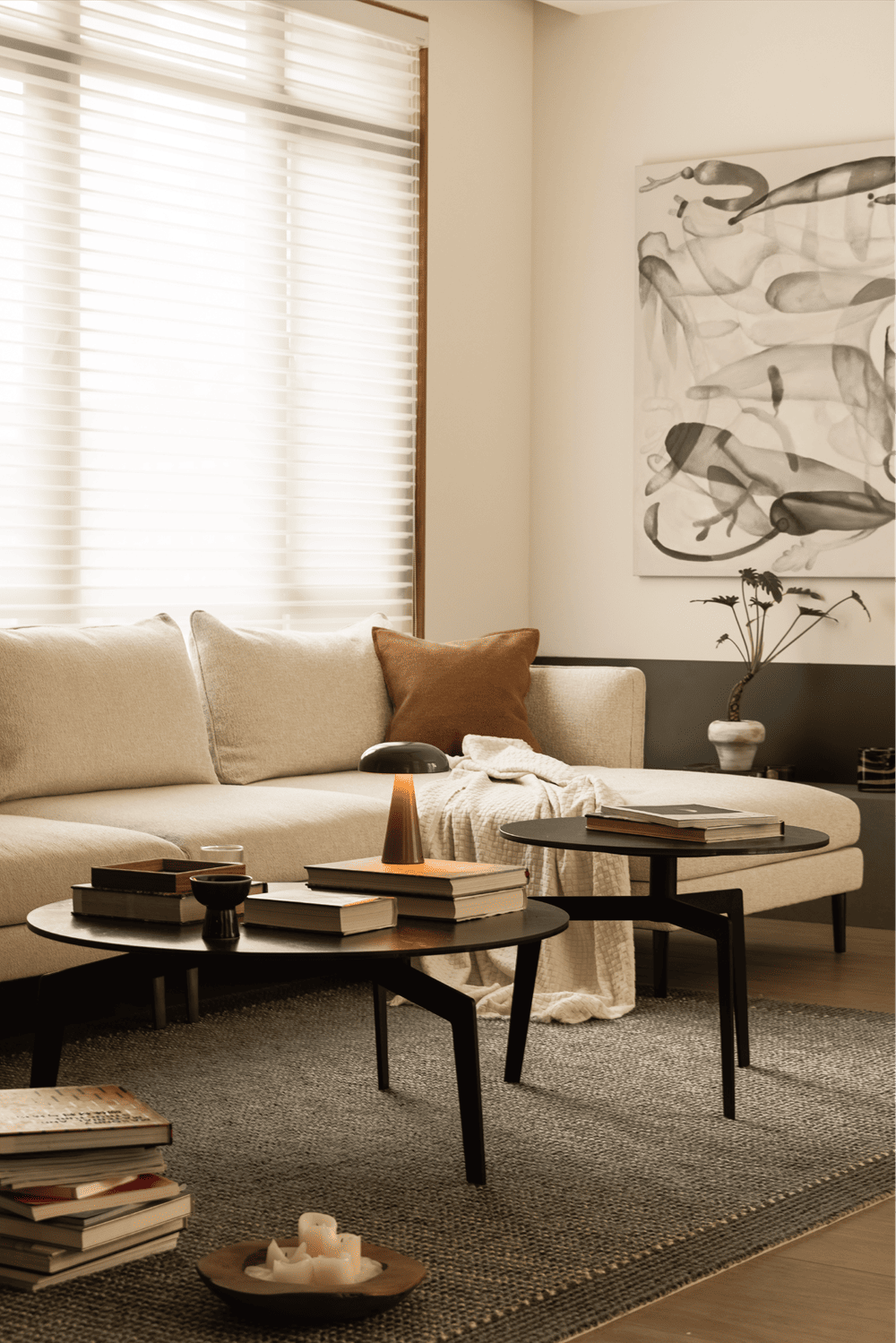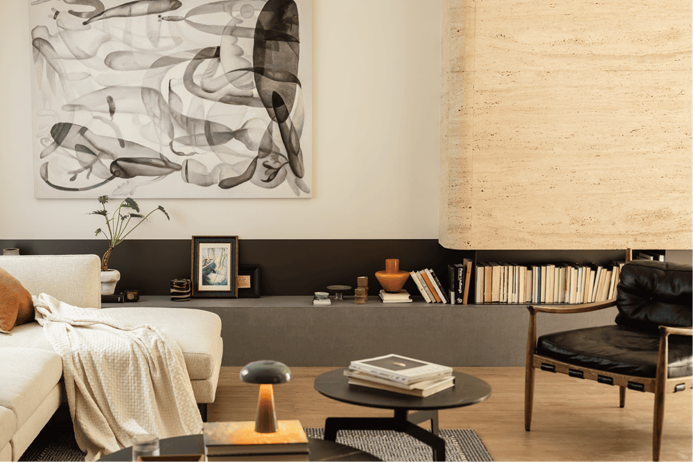 自然光从一侧引入下来,散落在这个静谧的地下休闲空间。平和的情绪之下,米黄,咖色,灰色......一系列温暖的色调将空间氛围描绘得温馨又舒适。装饰壁炉的线条层层叠叠地递进,在视觉上延展空间。大理石的不规则花纹与装饰画规律的线条在对比中达成平衡,让空间和谐而丰盈。
