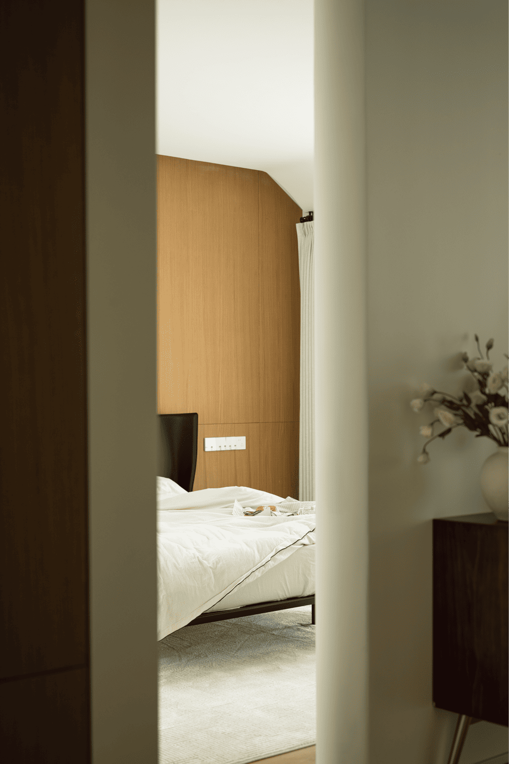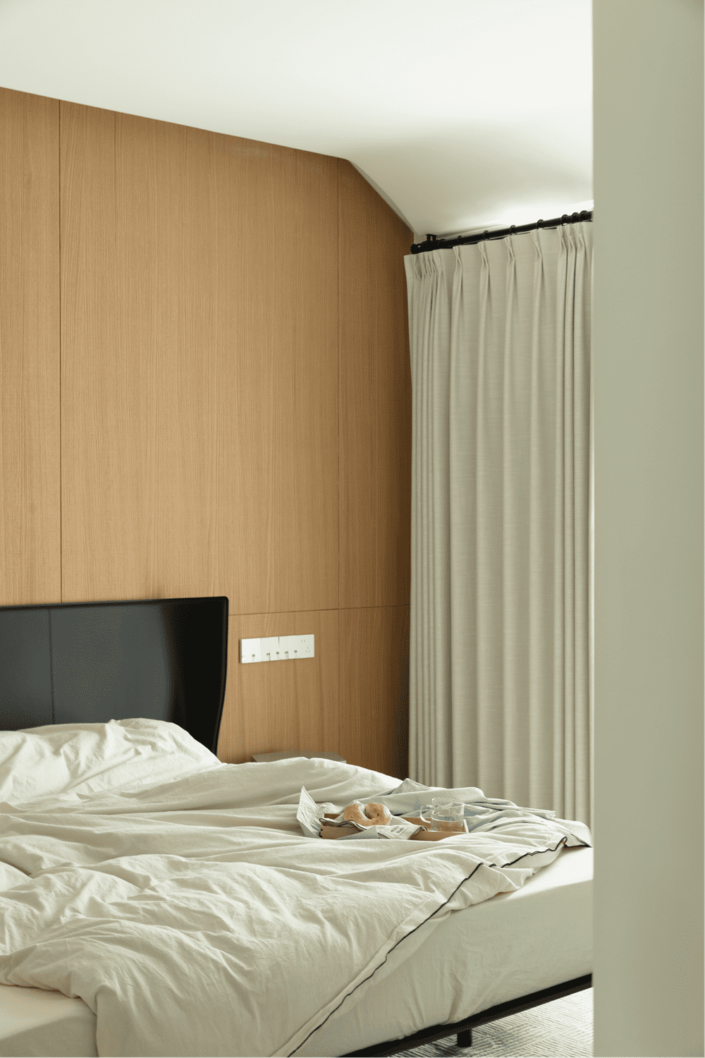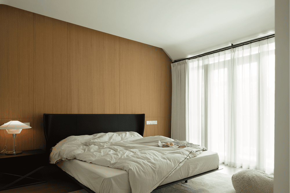 Bedroom with open design, the sink and vanity, connecting the bedroom in the line, so that the space is more convenient, the line is also more fluent. Dresser and storage with the help of the window space to establish, both bright light, but also to ensure that the space is organized and unified. The flooring material makes a distinction for the functional areas, and the natural stone and original wood colors throughout complement each other. The wood veneer wraps the bedroom in warmth and texture, and the sharp geometric lines are simple but powerful, creating a three-dimensional and rich sense of space.