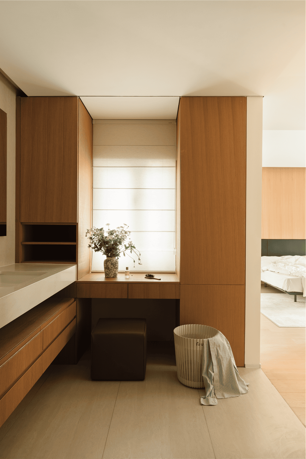 卧室采用开放式设计,将洗手台与化妆台,连接着卧房内动线,让空间更便利,动线也更加流畅。梳妆台与储物借助窗户的空间建立,既有明朗的光线,也保证了空间的有序统一。地面材质为功能区做了区分,贯穿始终的天然石材和原木色相得益彰。木饰面将卧室包裹得温暖而富有质感,利落的几何线条简约却极富力量,塑造出立体而丰富的空间感。