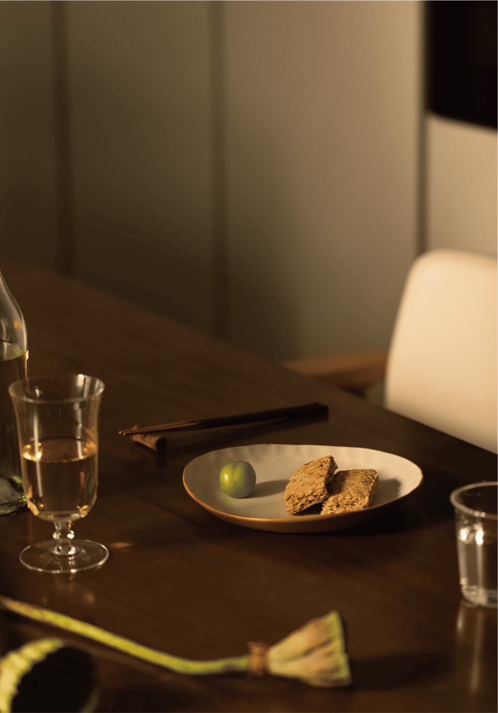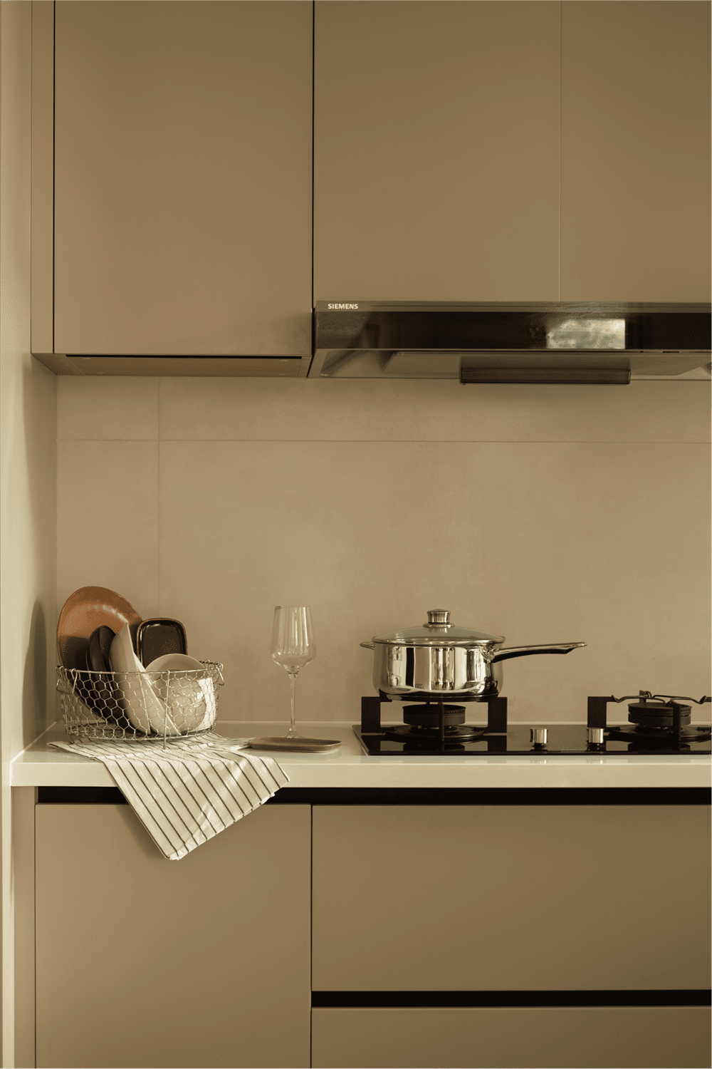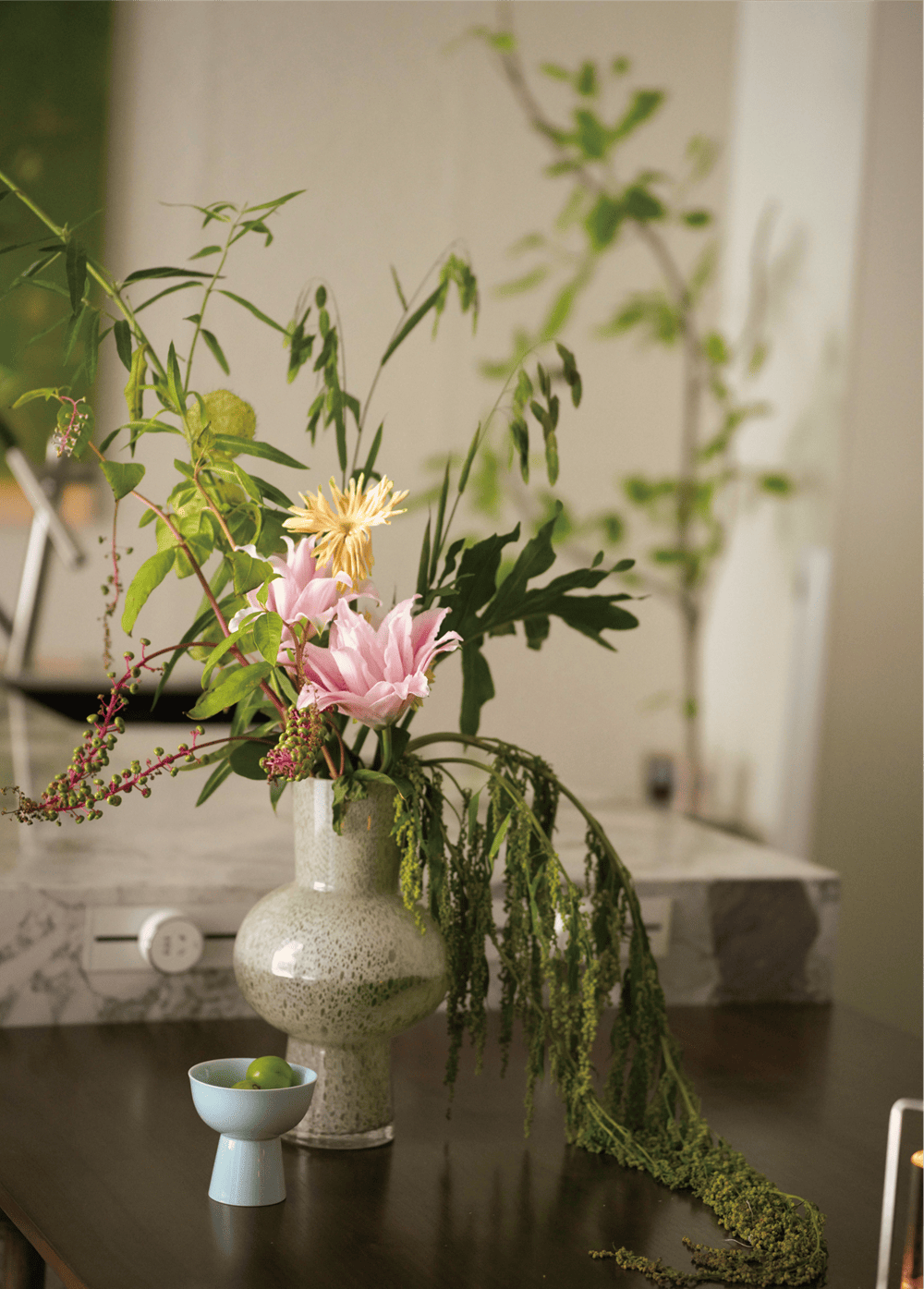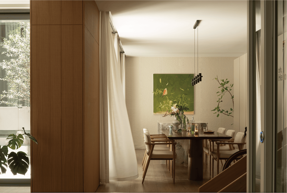功能区围绕庭院,并以窗作为衔接,让室内外没有边界。承重墙经过线条和材质的修饰,渗透进西厨储物区,成为视线范围内美好的装饰。从装饰画到绿植装饰,生命力和灵动感以不同的形式存在于餐厅里,绿色作为装饰色贯穿整个空间,呼应了室外的自然,调动空间情绪和氛围的同时,又塑造出清丽典雅的气质。