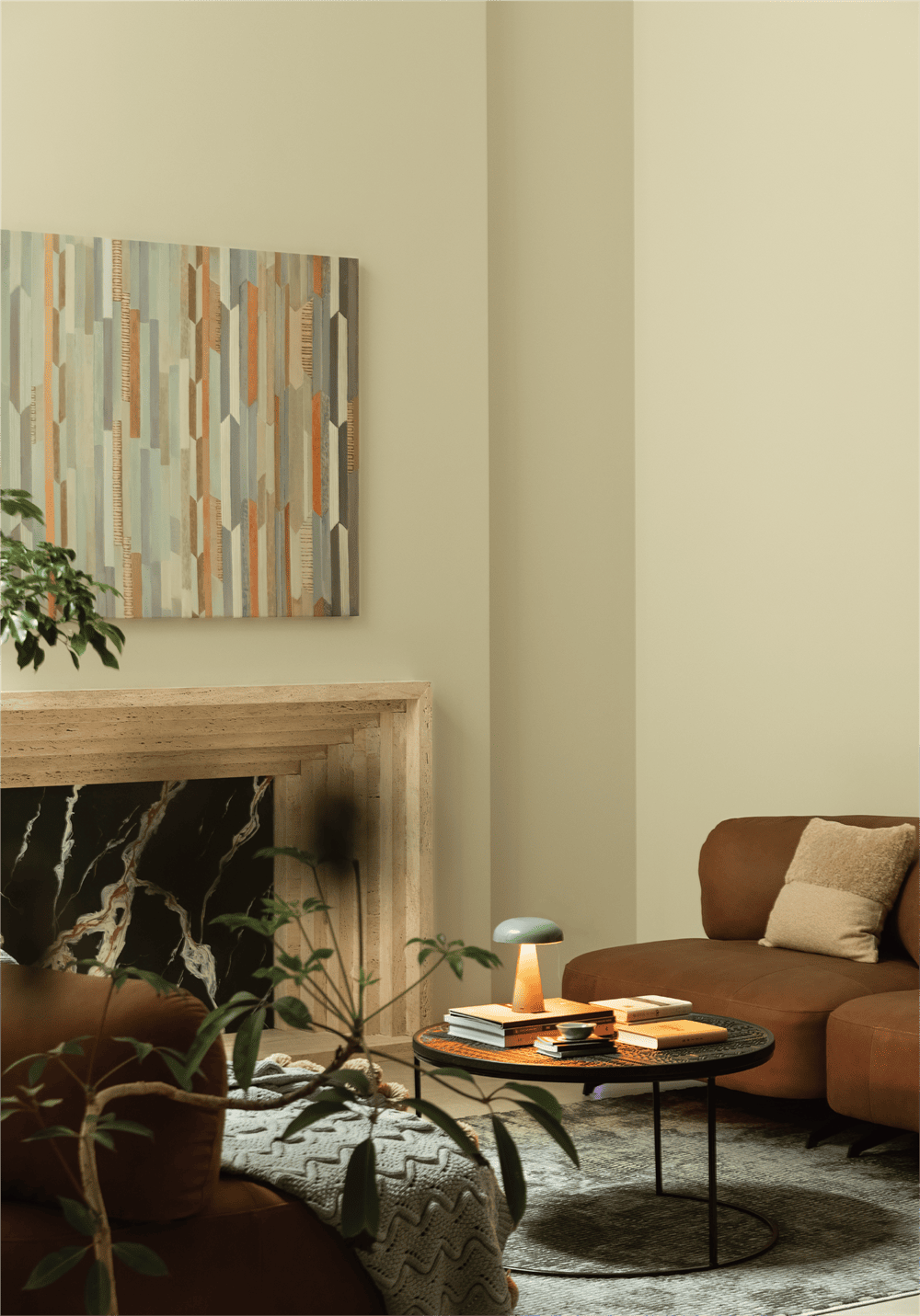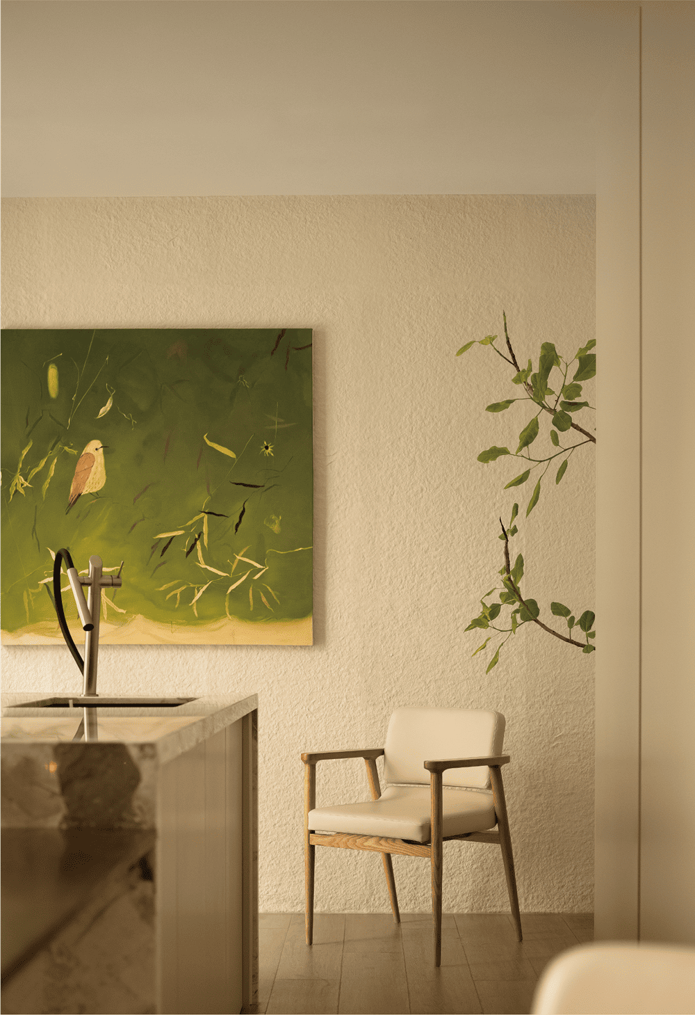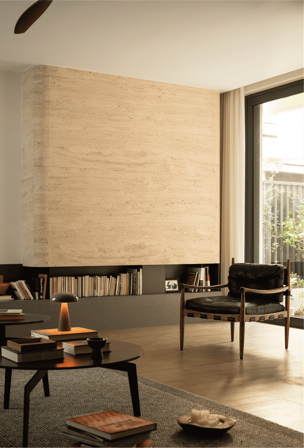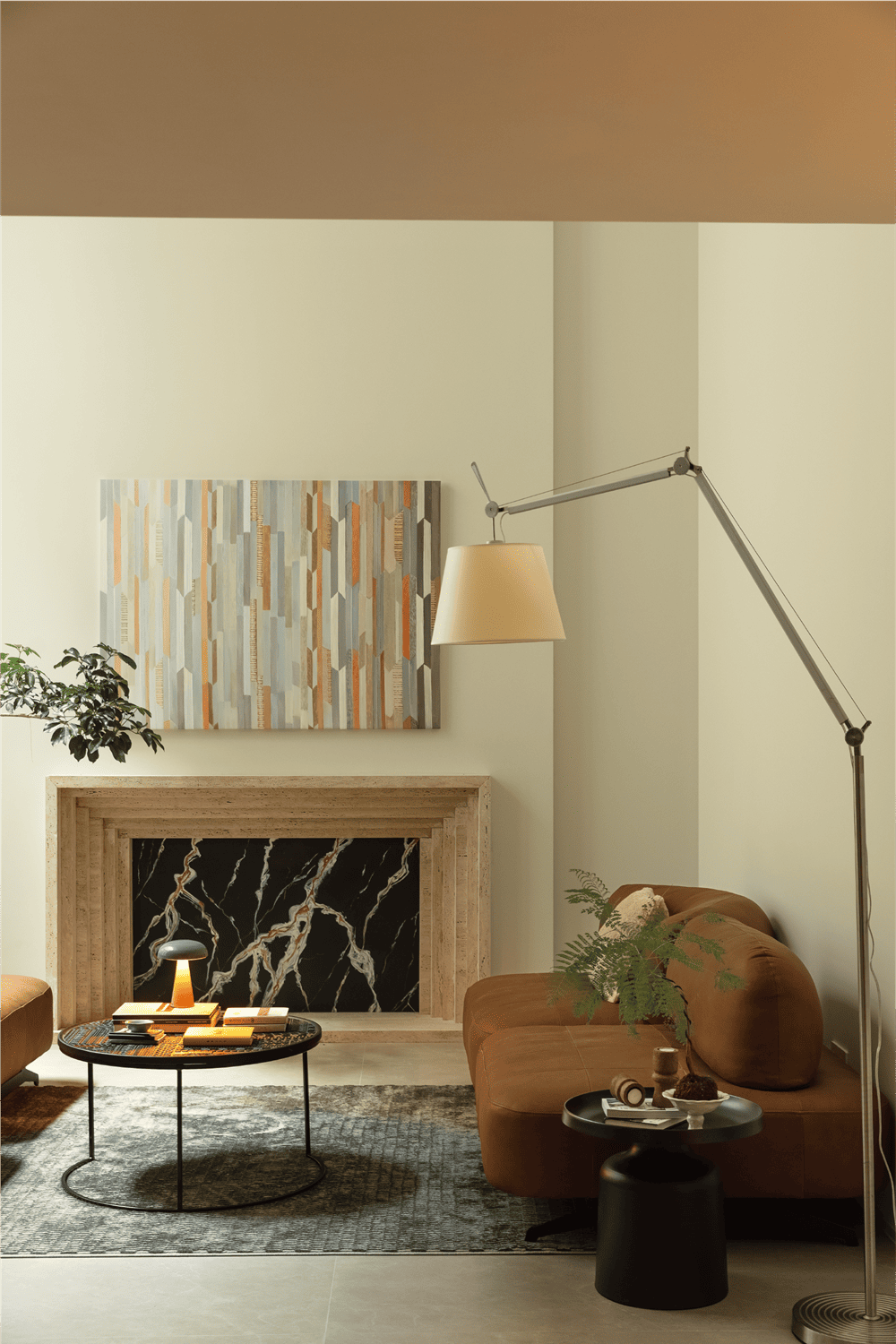 Natural light is brought down from one side and scattered in this quiet underground leisure space. Under the calm mood, beige, curry, gray ...... A series of warm hues portray the atmosphere of the space as warm and cozy. The lines of the decorative fireplace cascade in a progressive manner, visually extending the space. The irregular pattern of the marble and the regular lines of the decorative painting strike a balance in contrast, making the space harmonious and plentiful.