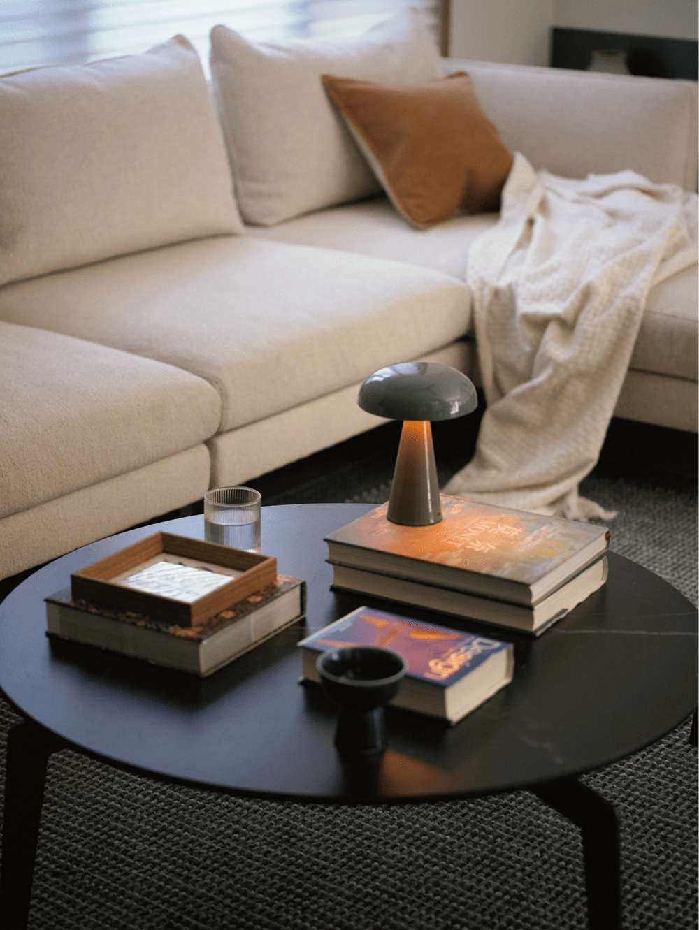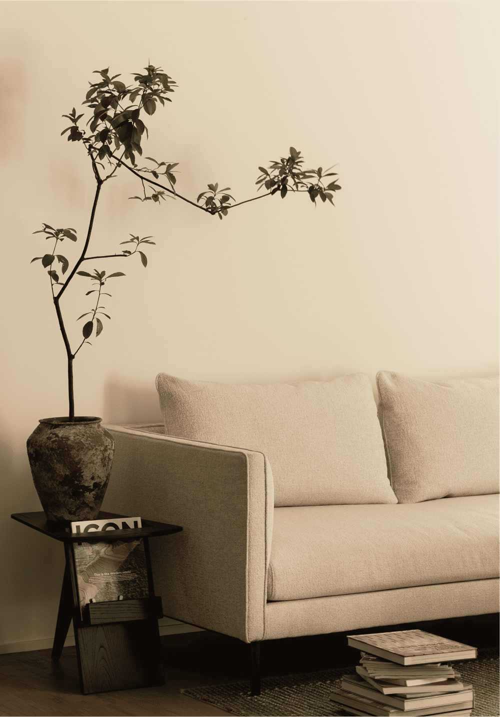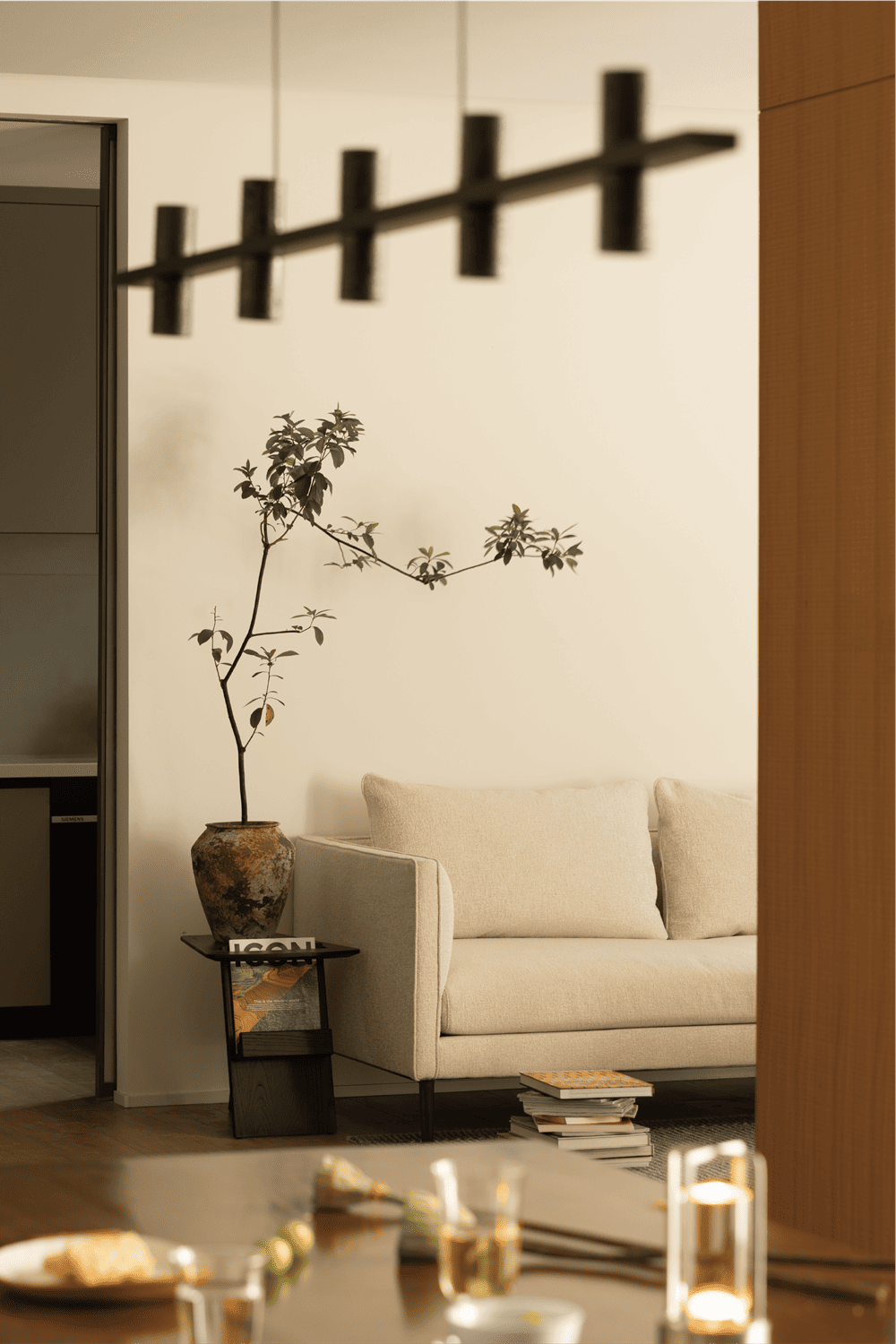 客厅家居以围合的形式,朝着院落的方向与自然席地对话,庭院风光一览无余,四季自此从户外偷偷溜了进来。空间的布局便以此为中心,展开着,自由而松弛。沙发后的开窗,与落地窗对流,形成通透的格局,光和空气涌入空间,让人倍感舒适。低饱和色系的温柔和材质的温度融合在一起,空间的舒适被具象化了。