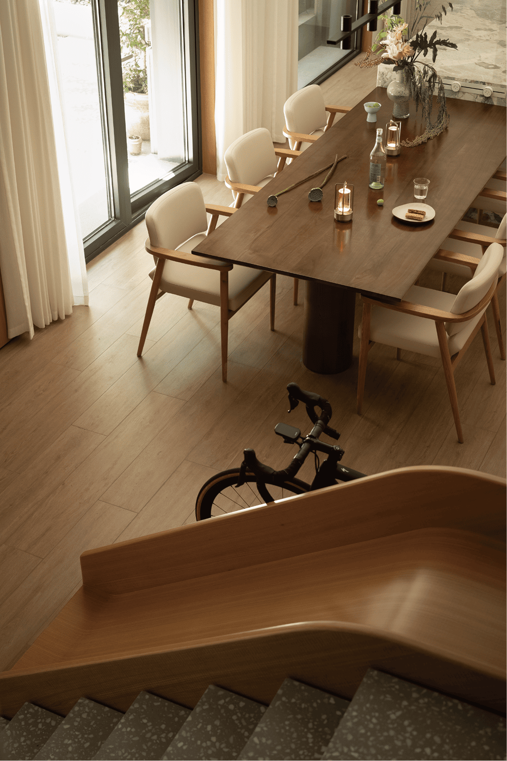 步梯,电梯,滑梯的并存,为不同家庭成员创造了适合的通行方式。步梯围绕电梯盘旋而上,不设扶手,却依然有足够的安全感,空间的开阔和松弛也得以留存。木质滑梯为小朋友创造了一个小小游乐场,为空间平添出无限的趣味。