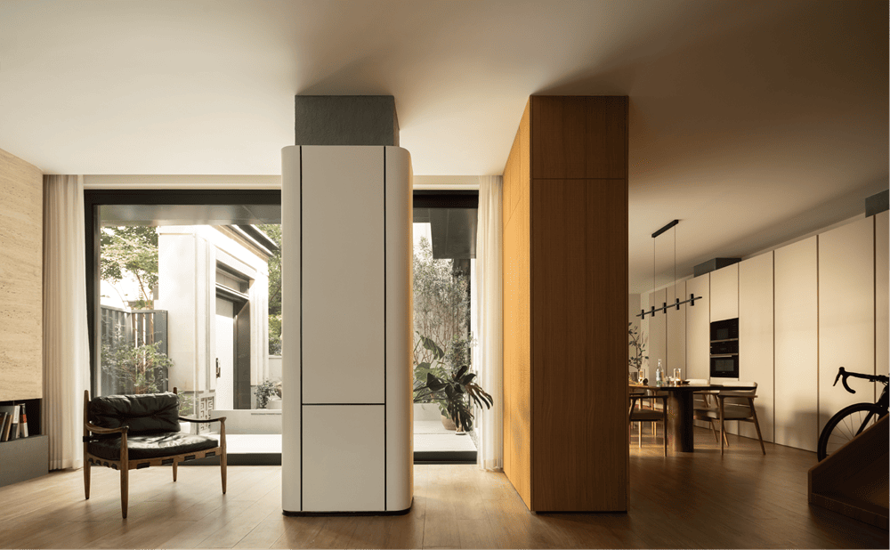 The coexistence of steps, elevators and slides creates suitable ways of passage for different family members. Steps hover around the elevator, without handrails, but still have a sufficient sense of security, and the openness and relaxation of the space can also be retained. The wooden slide creates a small playground for children, adding infinite fun to the space.