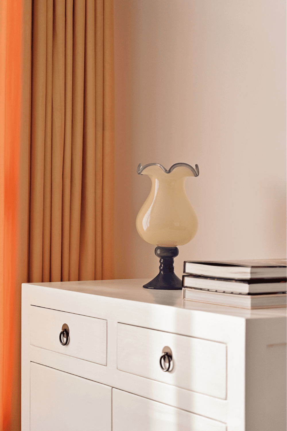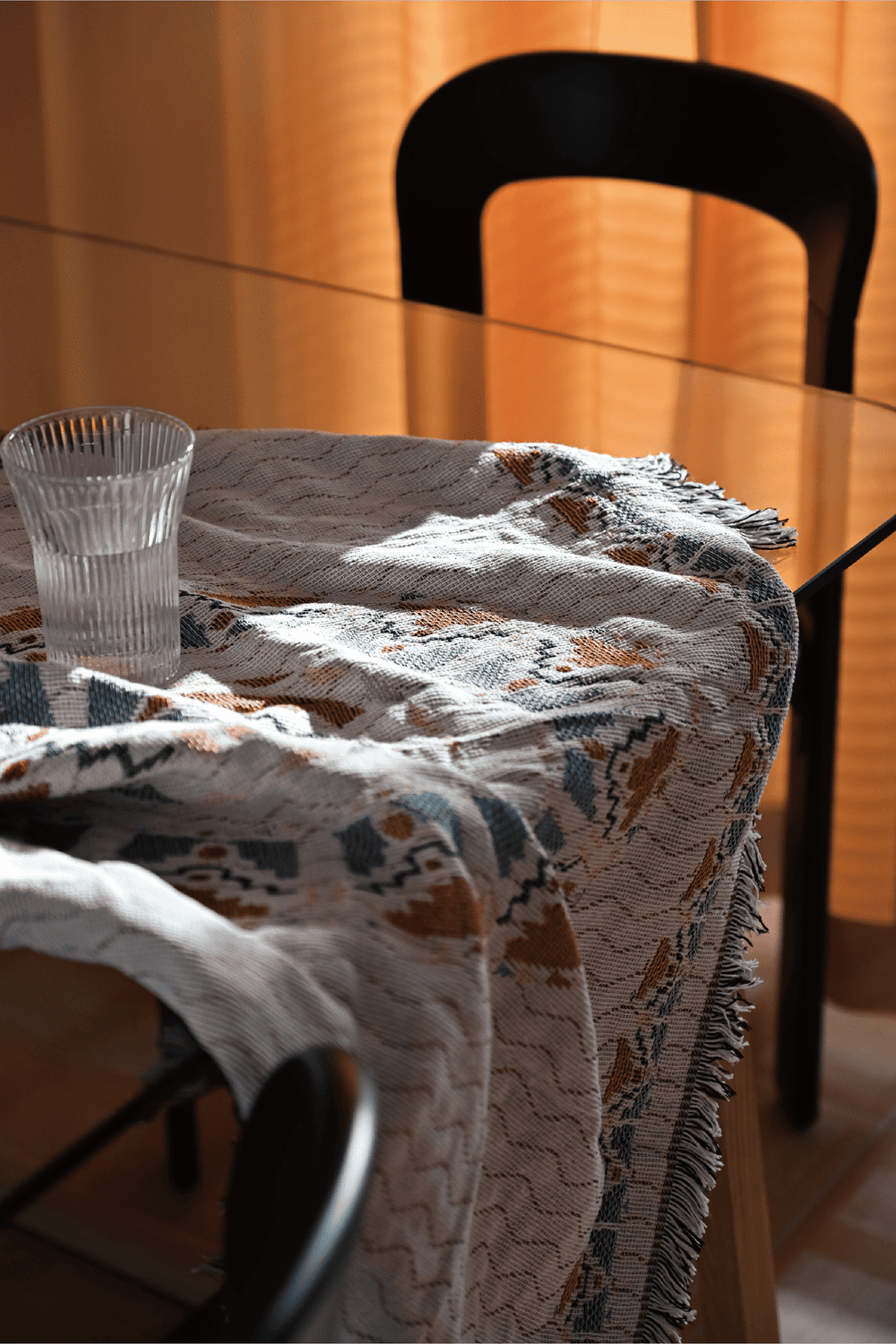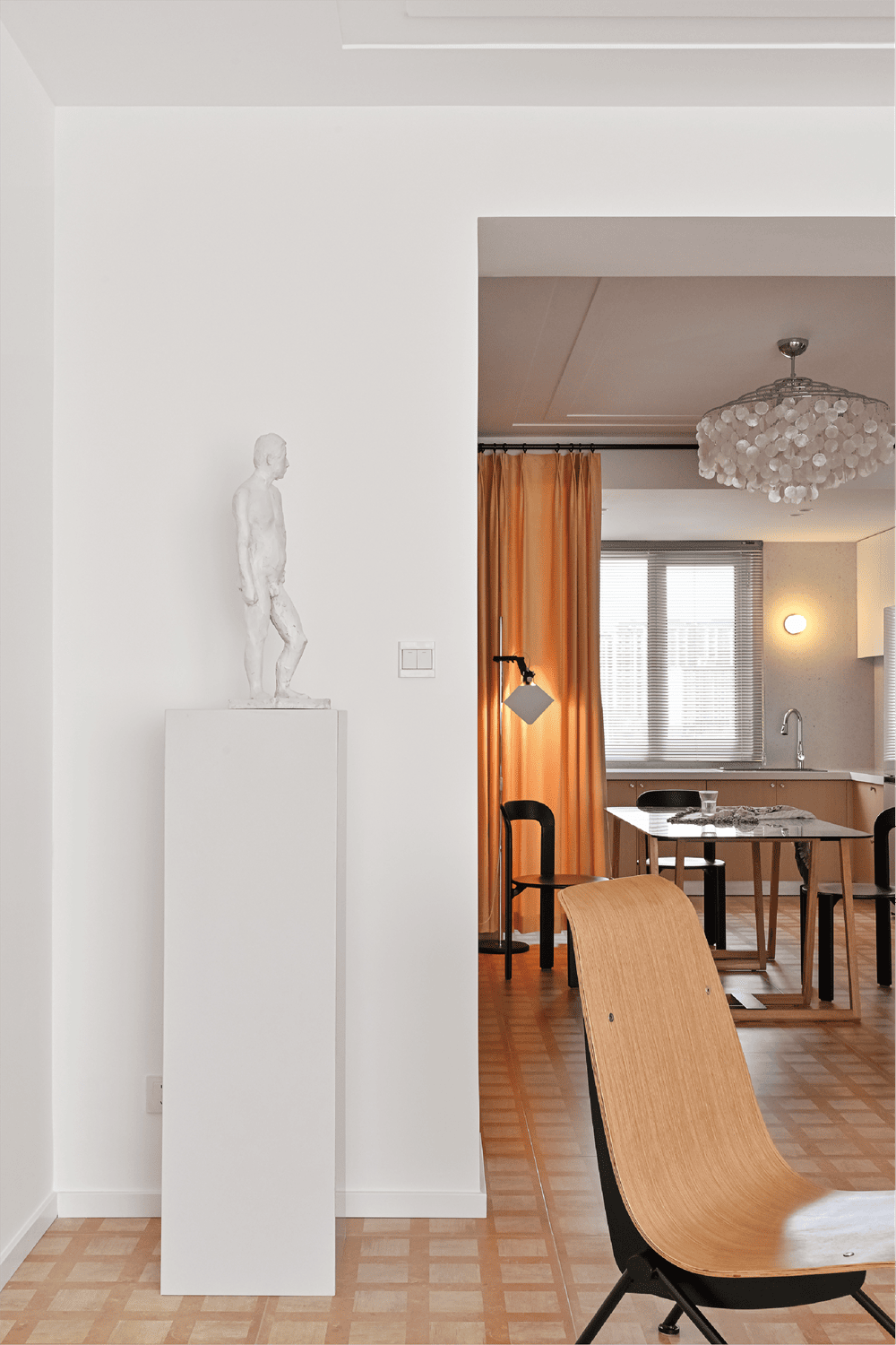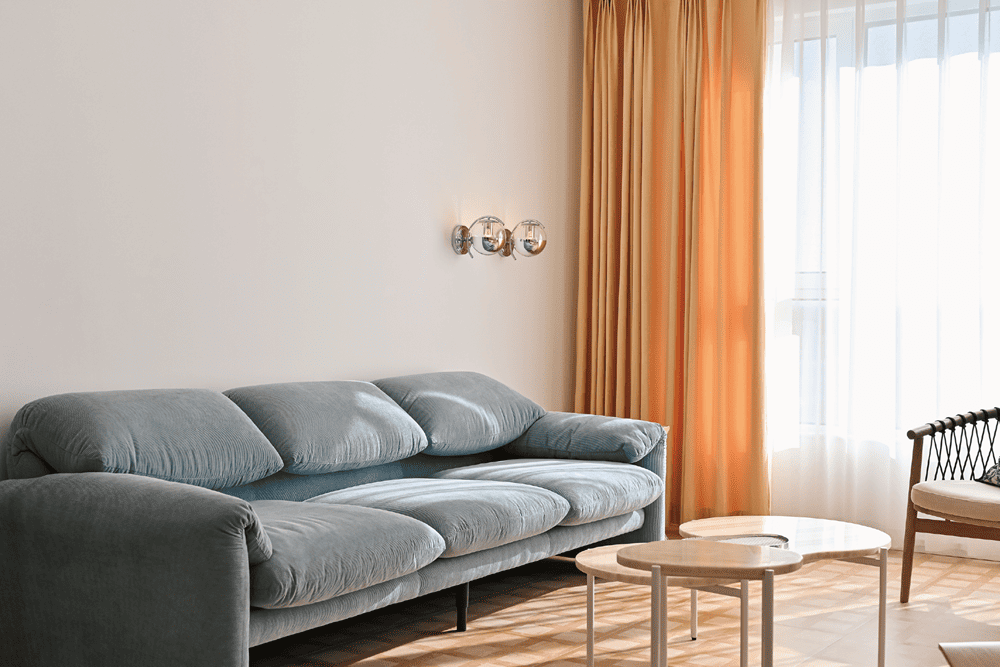 餐厅和厨房操作区是由一面窗帘轻轻地遮挡,依旧是浓烈的芝士颜色,看到它总会想做一顿丰盛而慵懒的早餐,在烤熟的面包上涂一层厚厚的芝士。钢化玻璃制成的餐桌面,让餐厅变得极为通透和轻盈,宴请朋友或者喝喝茶,这里就是最佳位置。