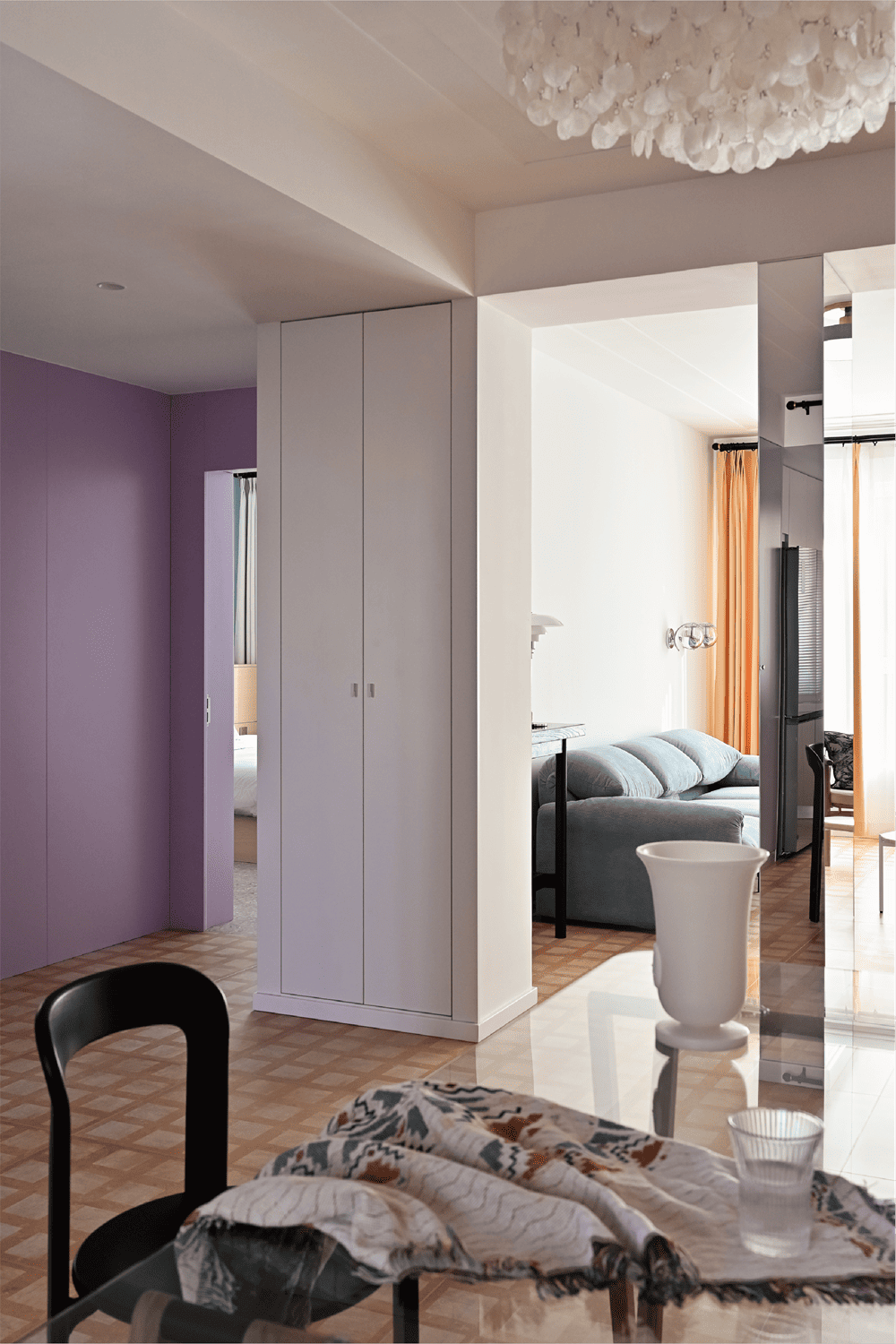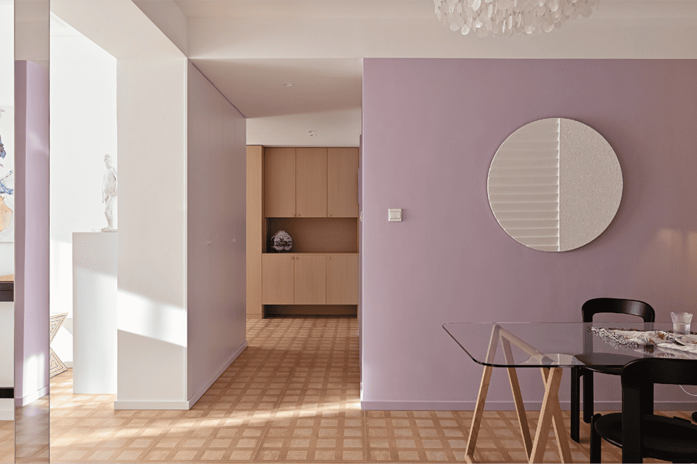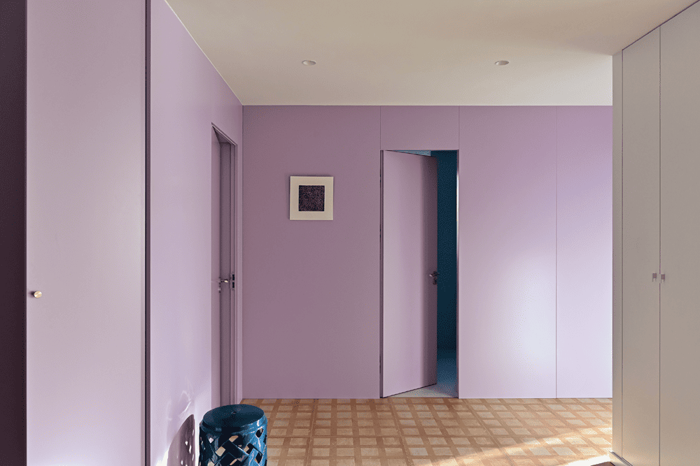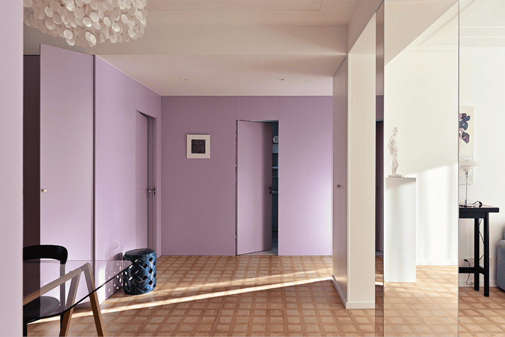 Wisteria is a plant unique to Tuscany that climbs all over the old, old brick walls in the summer. Therefore, we used a color close to wisteria on many walls of the house, so that when you are in the house, you can smell the wisteria, and the feeling of summer will come to you. The tiles on the floor are slightly aged, as if you were walking on the medieval stone paths of the old city of Siena. At different times of the day, the sunlight falls in different directions and at different color temperatures, and when the sunlight is diffusely reflected on the floor and then on the walls, the wisteria color takes on different shades of pink or purple.