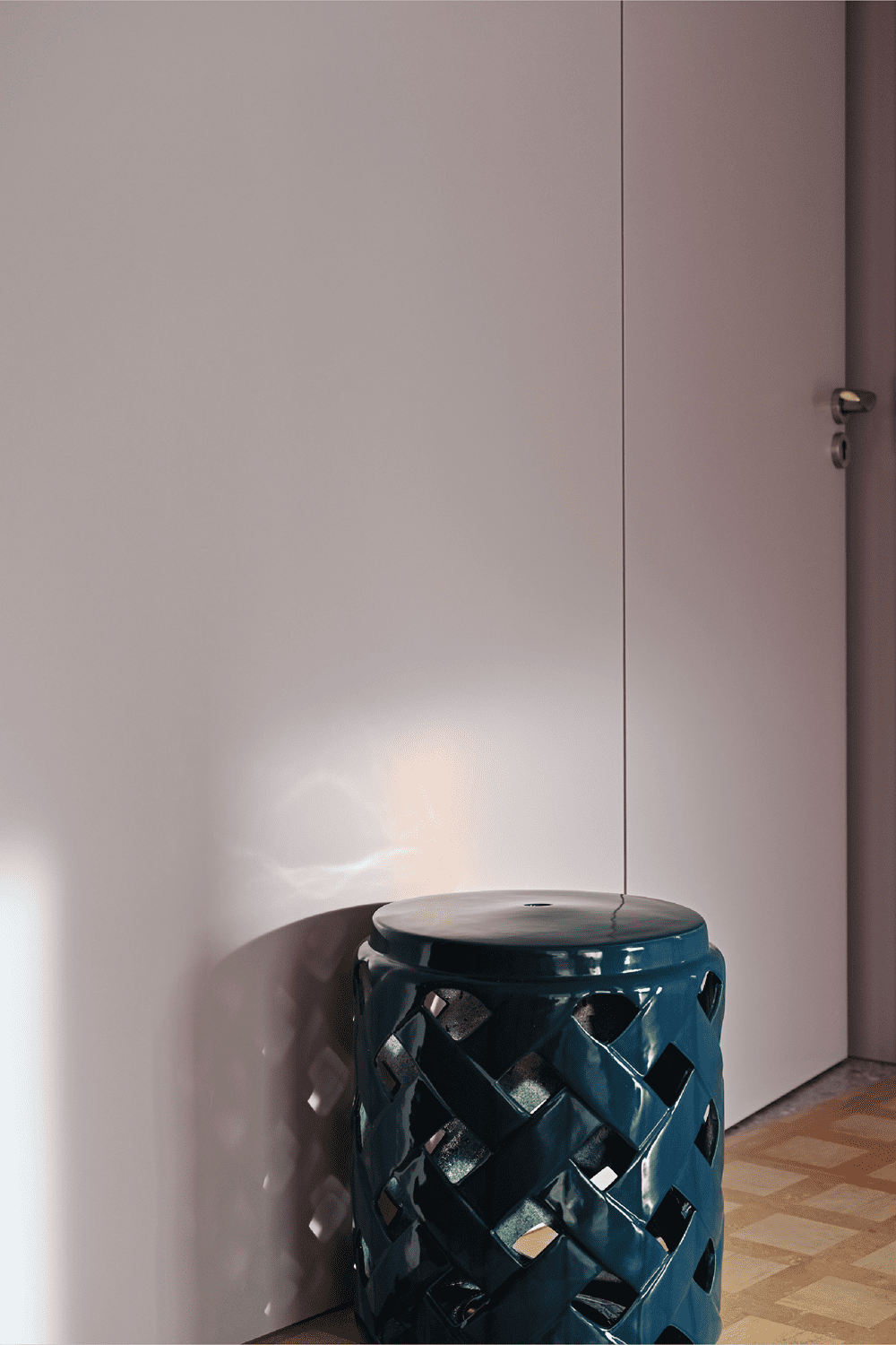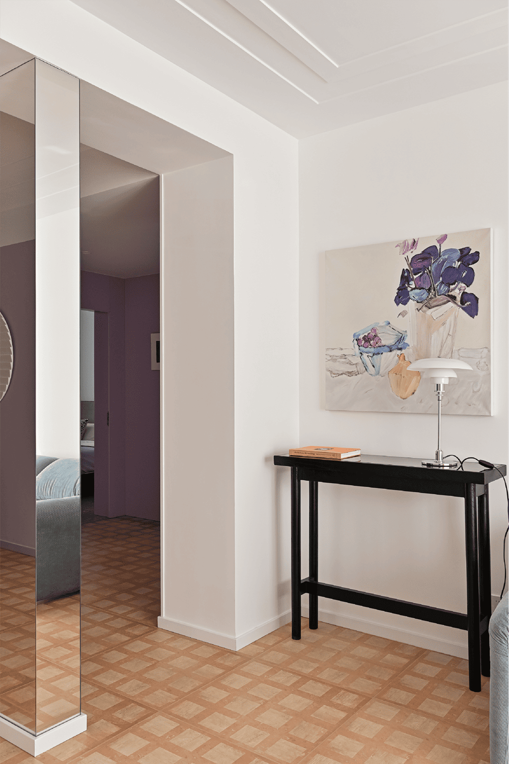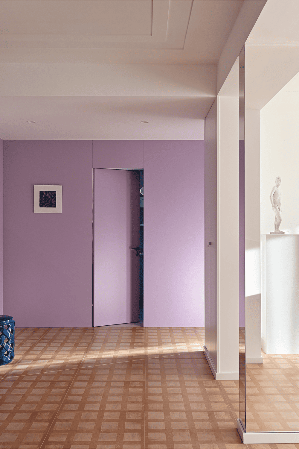 Wisteria is a plant unique to Tuscany that climbs all over the old, old brick walls in the summer. Therefore, we used a color close to wisteria on many walls of the house, so that when you are in the house, you can smell the wisteria, and the feeling of summer will come to you. The tiles on the floor are slightly aged, as if you were walking on the medieval stone paths of the old city of Siena. At different times of the day, the sunlight falls in different directions and at different color temperatures, and when the sunlight is diffusely reflected on the floor and then on the walls, the wisteria color takes on different shades of pink or purple.