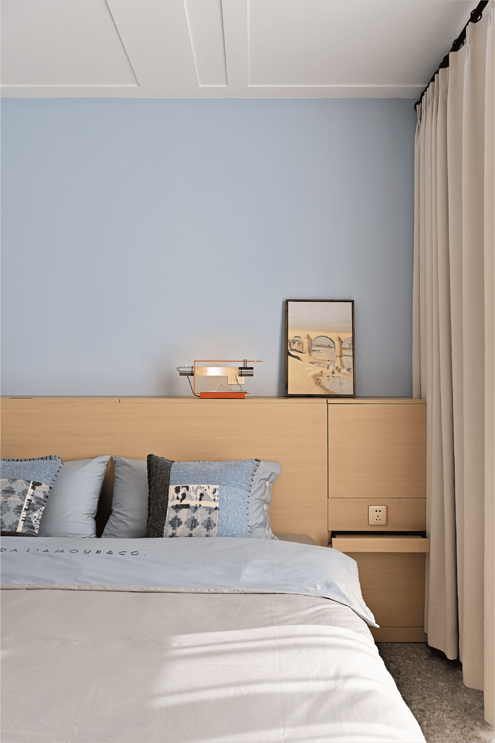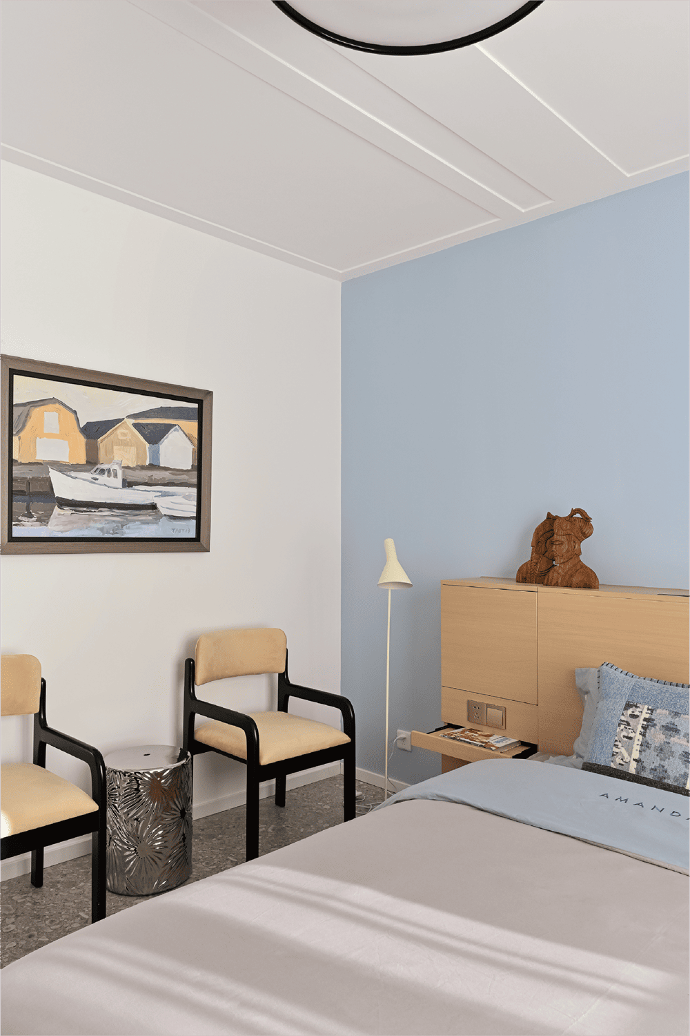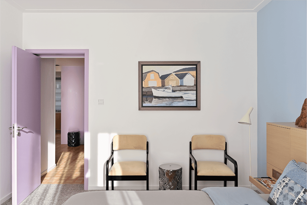 The wisteria-colored wall that extends from the dining room's high cabinets continues to the entrance of the master bedroom. Entering the master bedroom is a slightly different space, with a light blue wall as a backdrop, reminiscent of the midday sky, like this oil painting on the north wall depicting a small dock under the hot sun. A specially customized multi-functional headboard box can hold many of life's sundries in a simple and useful way. The house originally had three bedrooms, and we converted a small bedroom directly opposite the entrance door into an open checkroom, thus freeing up more space in the master and second bedrooms.