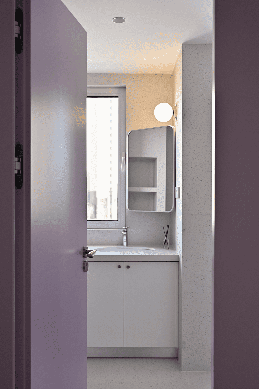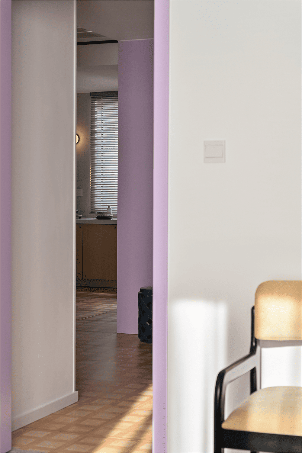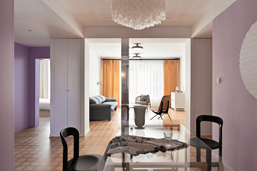 紫藤是托斯卡纳特有的一种植物,夏日会爬满旧旧的砖墙。因此,我们在房子的多面墙壁上都应用了接近紫藤的一种颜色,置身其中,便好似能闻到紫藤的味道,夏日的感觉就会扑面而来。地面瓷砖微微发旧,宛若走在锡耶纳古城中世纪就存在的石板路上。房子在一天当中的不同时间段,阳光洒落的方向和色温也不尽相同,阳光经过地面的漫反射再映到墙壁上时,紫藤色也会呈现出不同感觉的粉或紫。