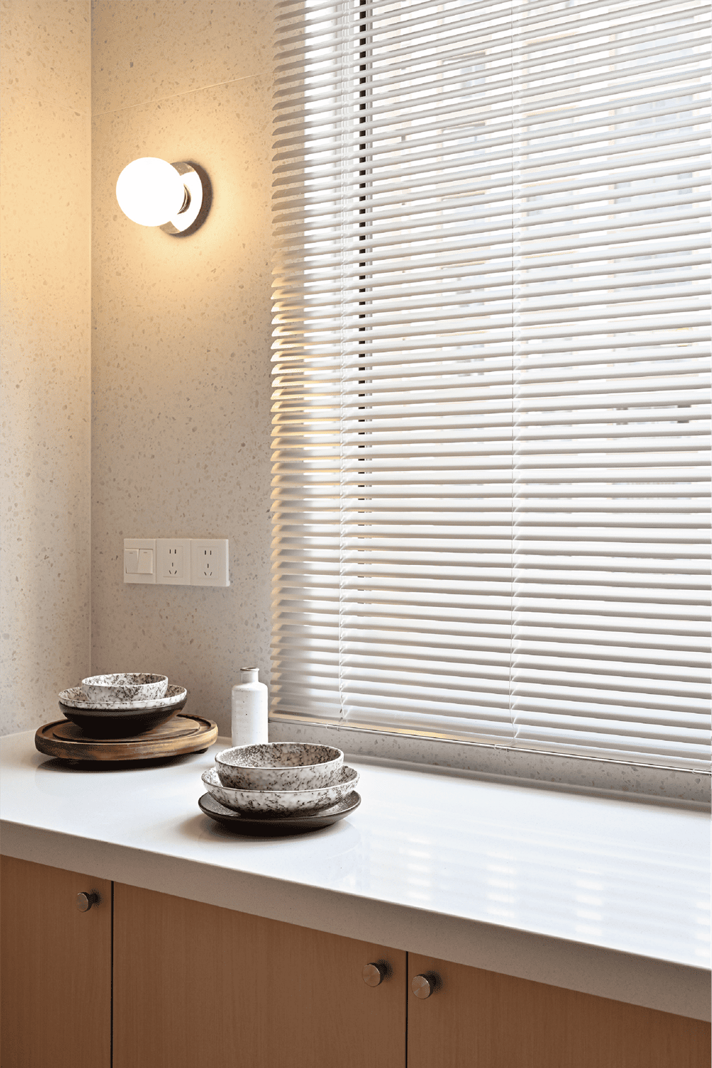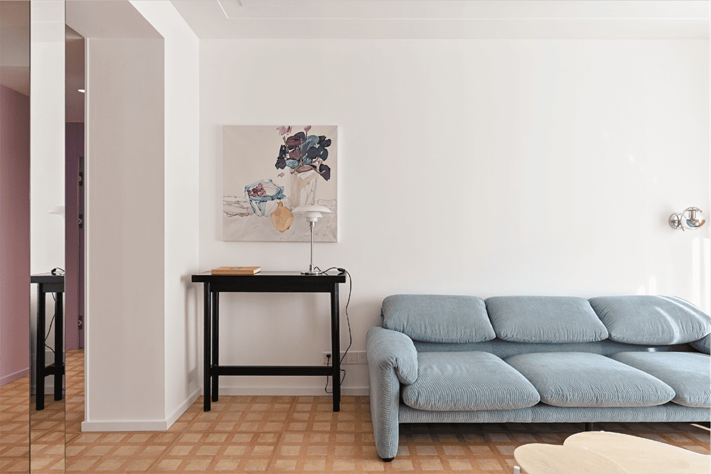 The living room is predominantly white, contrasted with cheese-colored curtains, and a custom-made shaped white travertine coffee table sits lightly in the middle of the living room, matching high and low. The east wall is customized with an oil painting at one end, a blue glass bowl filled with grapes and a vase filled with purple flowers, clumsy and vivid, like a still life painting by Cézanne, half realistic and half imagined. On the west wall hangs an abstract painting made up of countless horizontal lines, from a distance it looks like a painting with only a base color, and when the sunlight pours on it, it just forms its final state. A stool made up of geometric shapes is pasted from shells, a quirky style that adds an exotic touch to the living room.