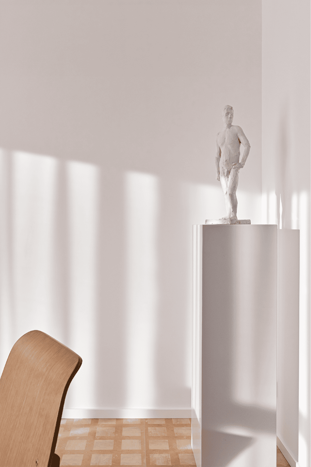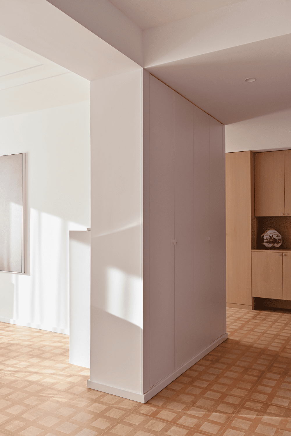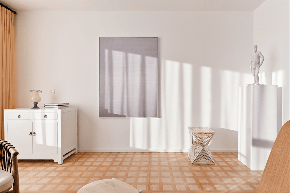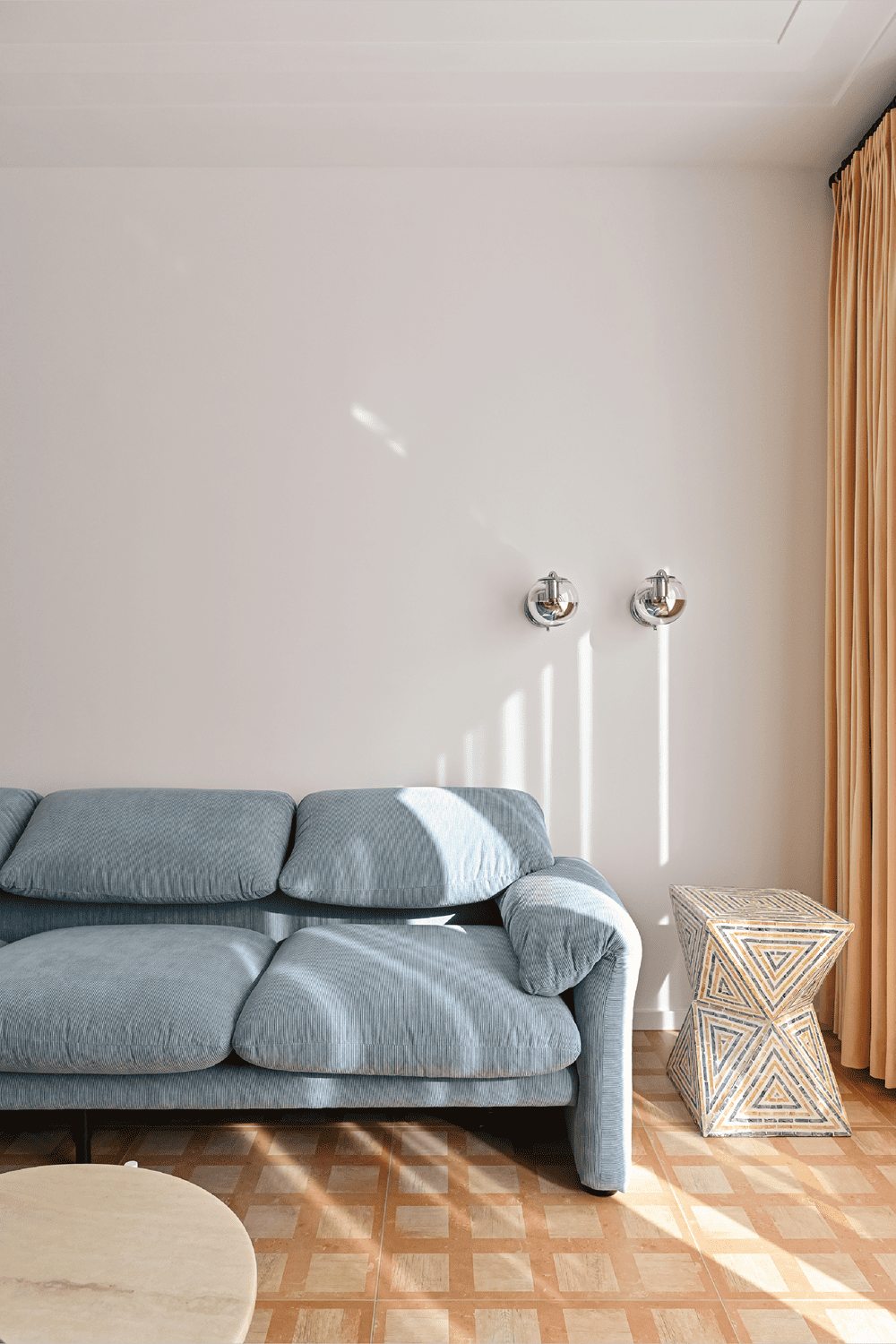 客厅以白色为主,而形成鲜明对比的是芝士颜色的窗帘,量身定制的异形白色洞石茶几轻盈地摆在客厅中间,高低搭配。东侧墙壁一端定制一幅写意油画,蓝色的玻璃碗里放满了葡萄,花瓶里插满了紫色的花朵,笨拙而生动,就像塞尚的静物画作,一半写实一半想象。西侧墙壁则挂着一幅由无数根横向线条构成的抽象画,远看就是一幅只上了底色的画,阳光洒在它上面的时候,就正好形成了它的最终态。一个由几何形体构成的凳子是由贝壳粘贴而成,怪异的风格给客厅增添了异域风情。