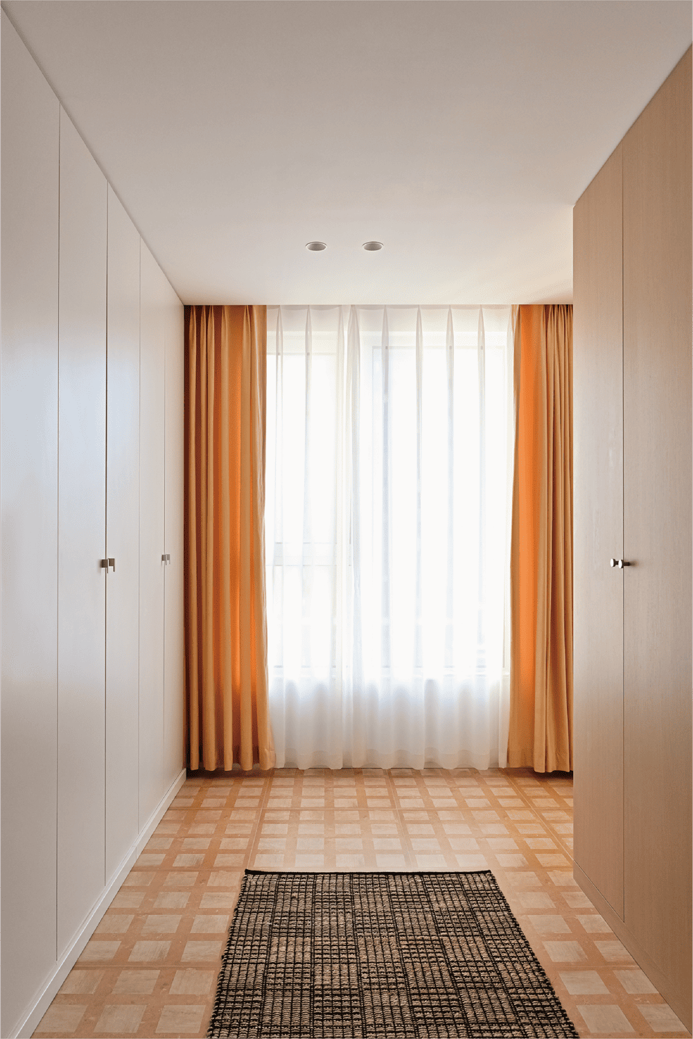 The living room and the dining room have a weak separation relationship, the living room is set on both sides of the storage cabinets, and the wall is one, so that people do not feel its existence. In the middle of the cabinets on both sides, a four-sided mirror is specially designed, which can bring in more light, and people will see different scenes when they are in different angles, and the contents of the virtual and real will form a lot of interesting combinations, such as kaleidoscopes. Mirrors and cabinets outline two different scales of the doorway, as in a shuttle in an ancient Roman building.