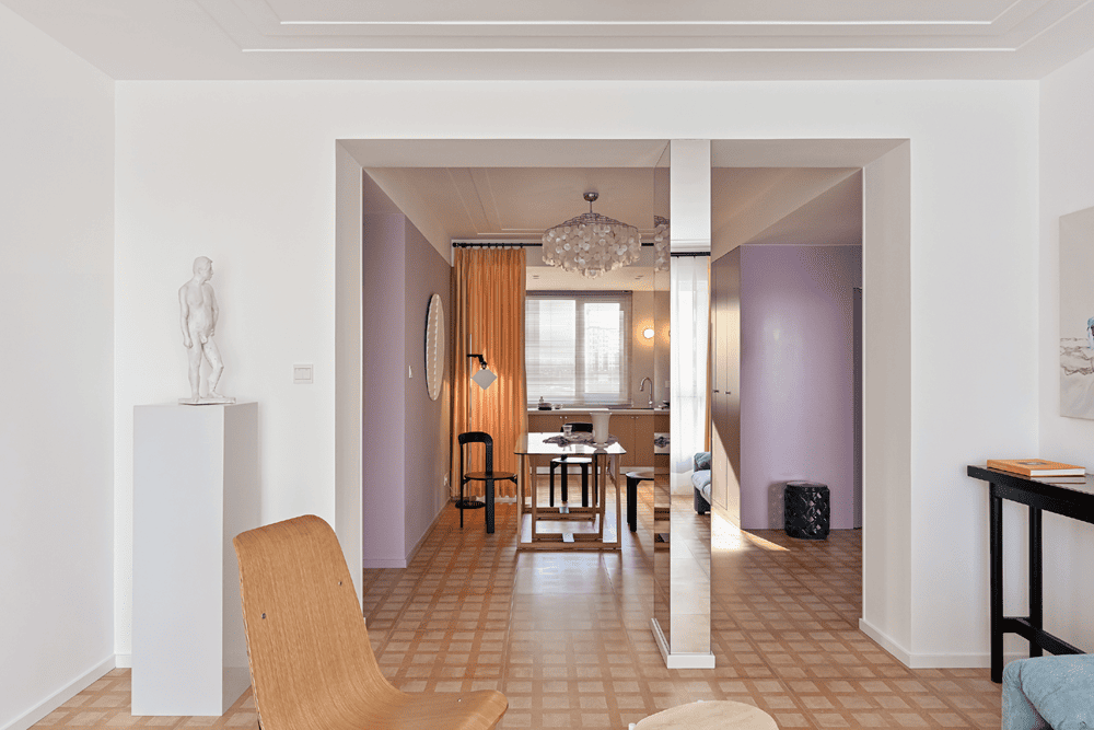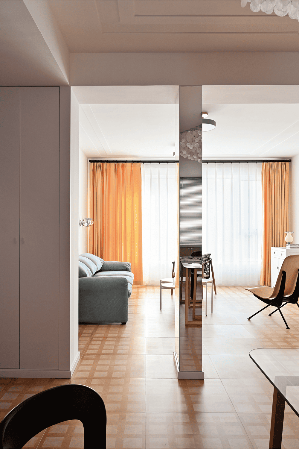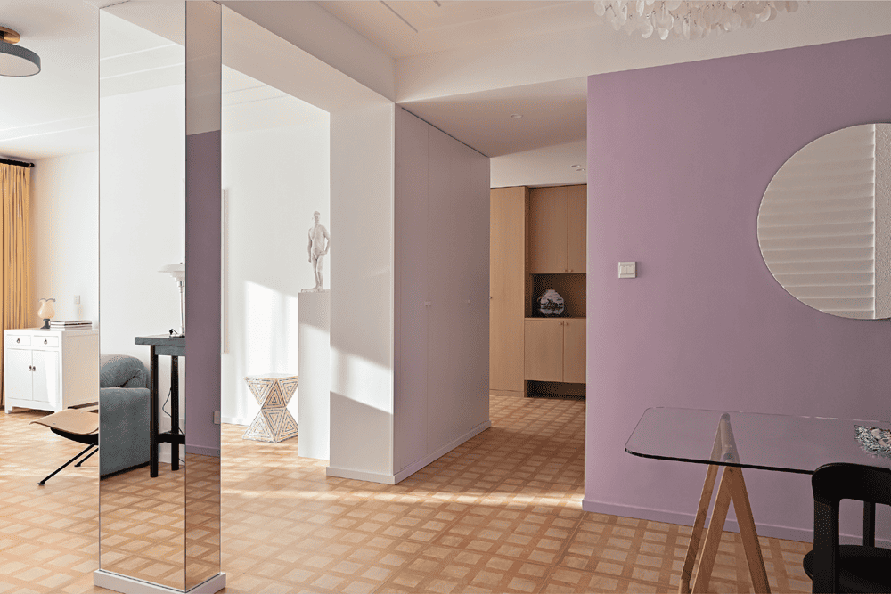 客厅和餐厅有微弱的区隔关系,客厅两侧设置有储物柜,与墙壁浑然一体,让人感觉不到它的存在。而在两侧柜子的中间,特别设计了一个四面镜,除了可以引入更多光线,人处在不同的角度时会看到不同的景象,虚与实的内容会形成很多有趣的组合,如万花筒一般。镜子与柜子勾勒出两块尺度不一的门洞,如同穿梭于一处古罗马建筑。