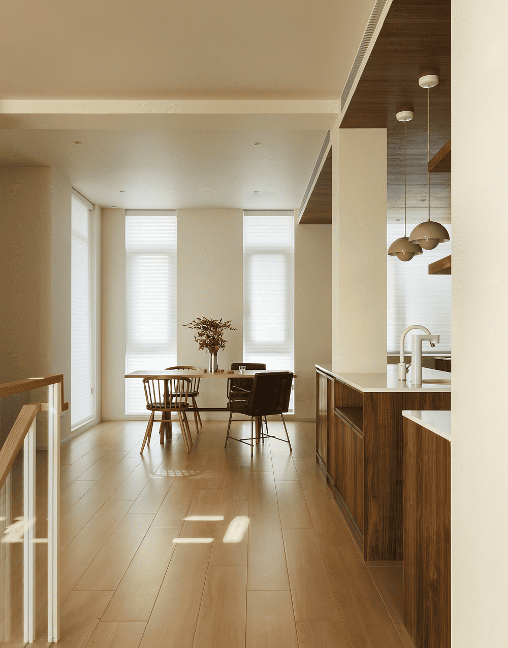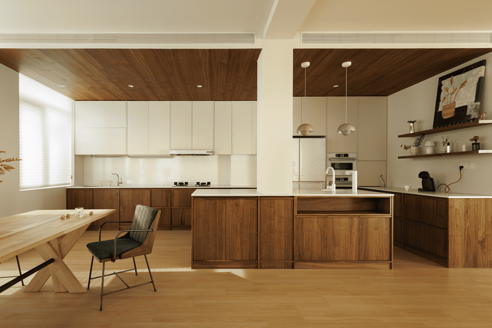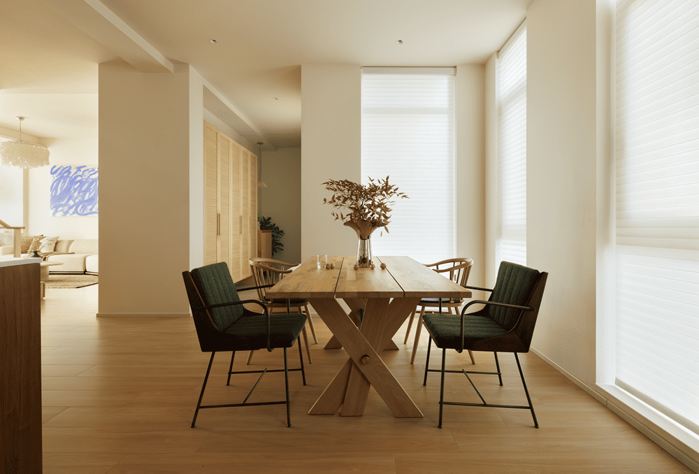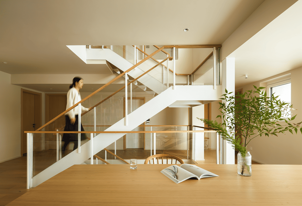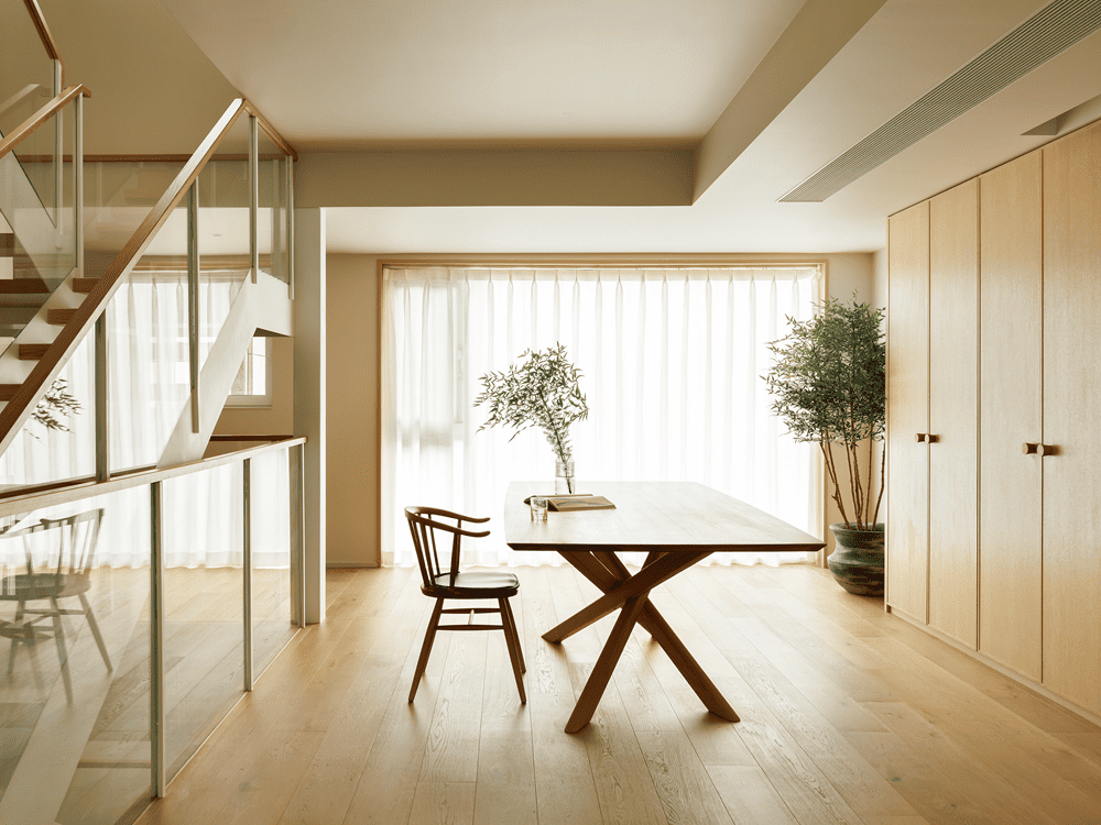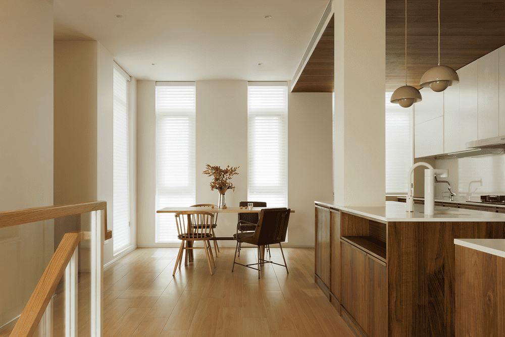 The dining and kitchen area is divided by the staircase to the other side, using a more subdued wood color to separate it from the lighter tones of the rest of the space. With the staircase relocated, the kitchen and dining area are expanded, creating a spacious and cozy dining environment.
