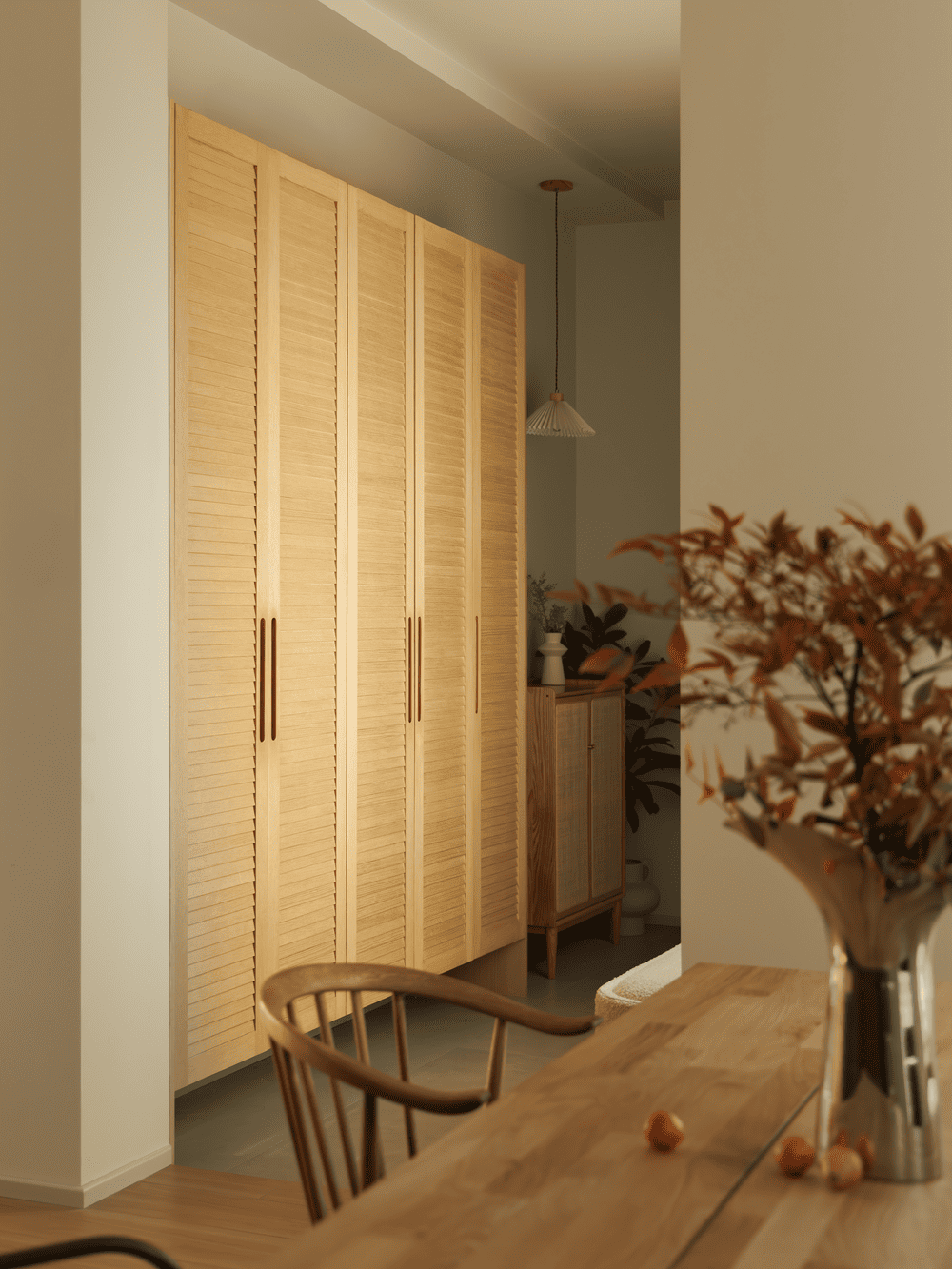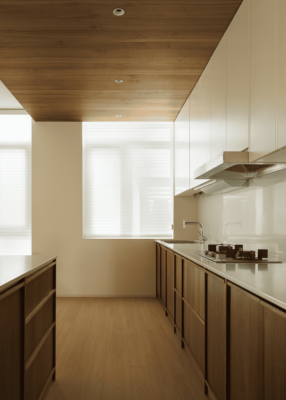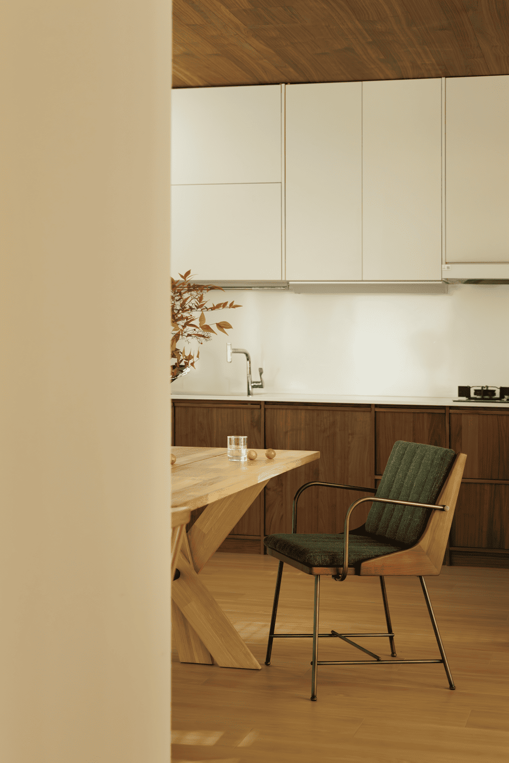 The dining and kitchen area is divided by the staircase to the other side, using a more subdued wood color to separate it from the lighter tones of the rest of the space. With the staircase relocated, the kitchen and dining area are expanded, creating a spacious and cozy dining environment.