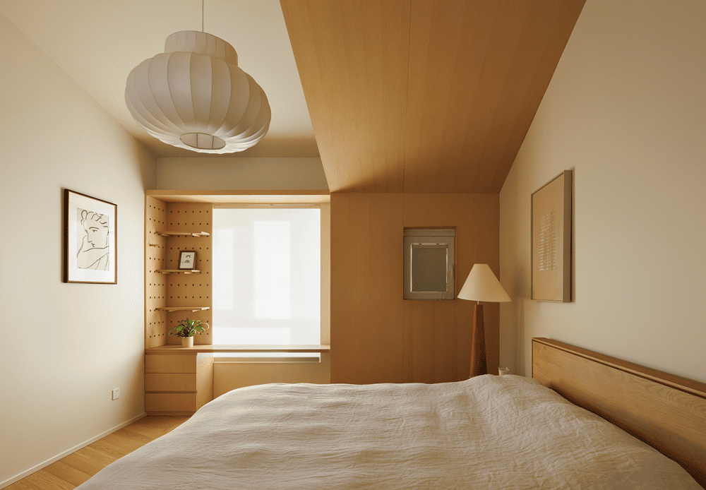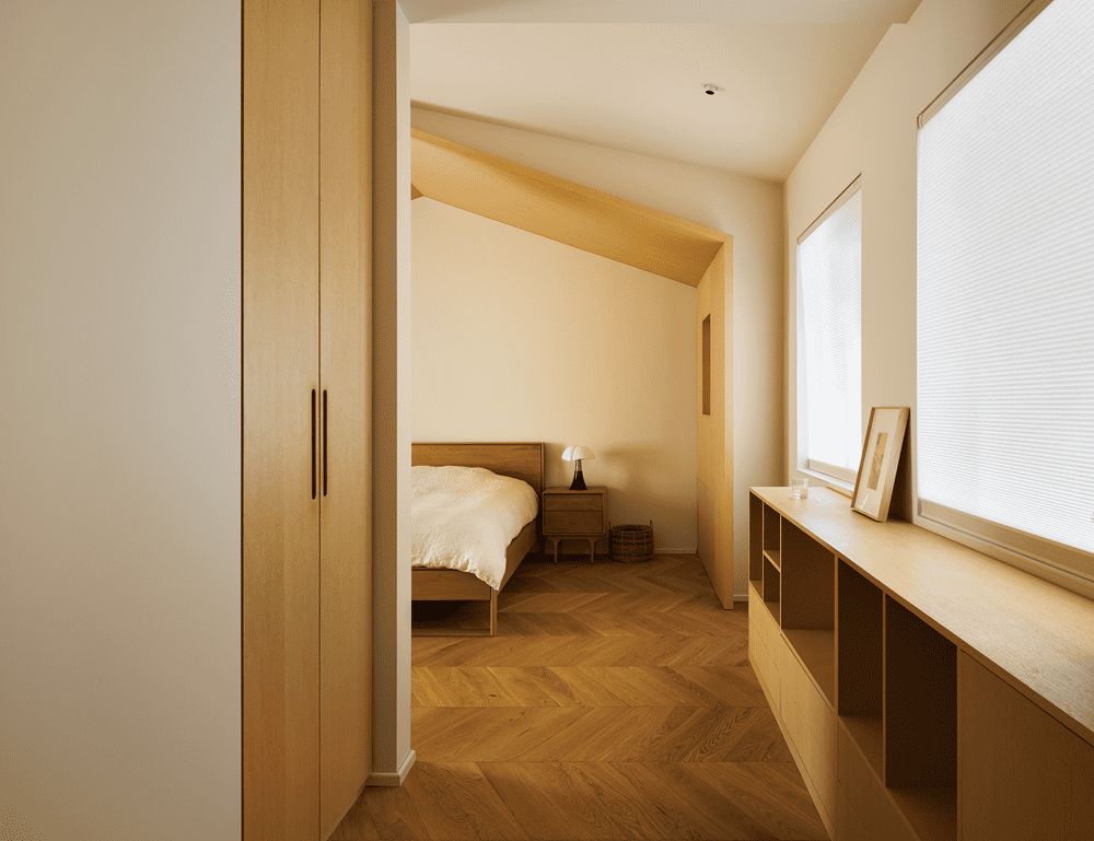 三层则是主卧套房,配备了独立的衣帽间和卫浴设施,满足了主人的日常需求。睡眠区巧妙地利用了坡顶、斜梁和凸出的墙面,木质包裹营造出一个温暖而具有安全感的“屋中之屋”。卧室一角还设有书桌,方便主人进行临时办公或阅读。