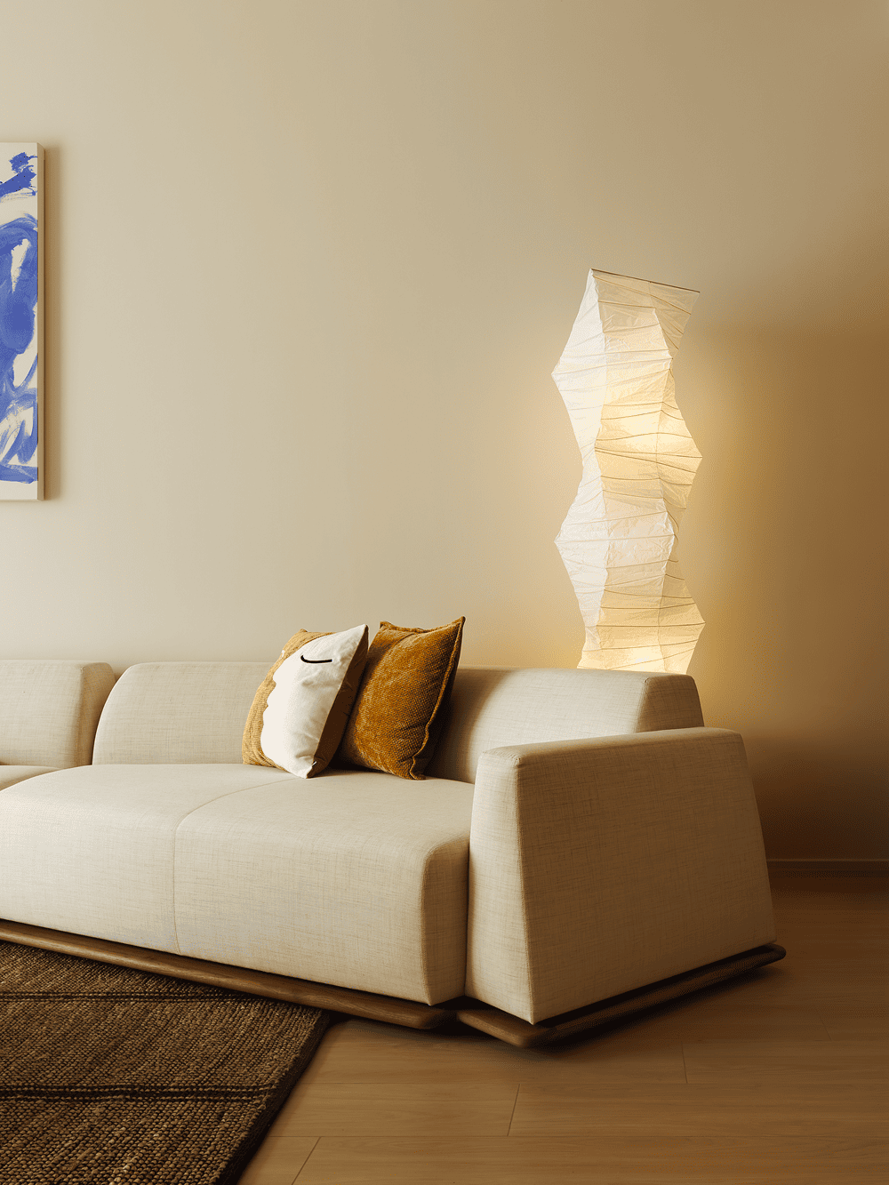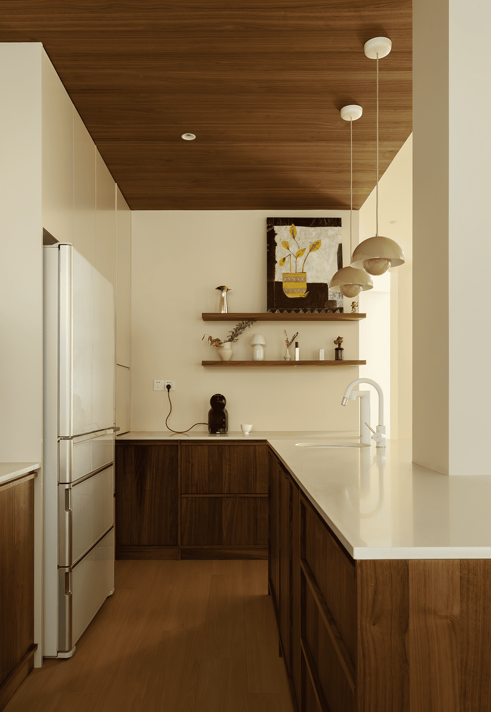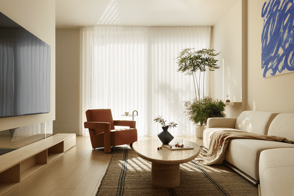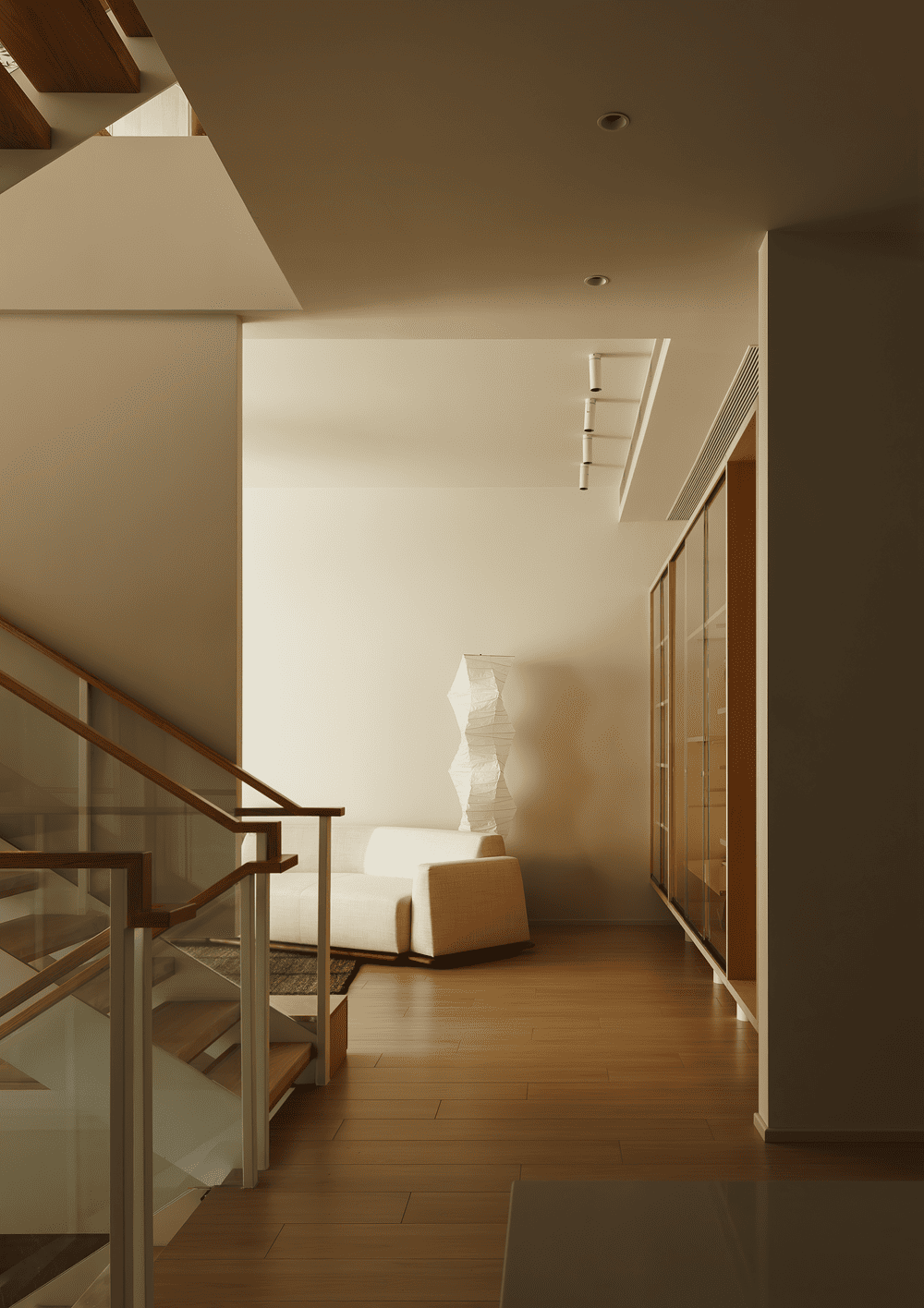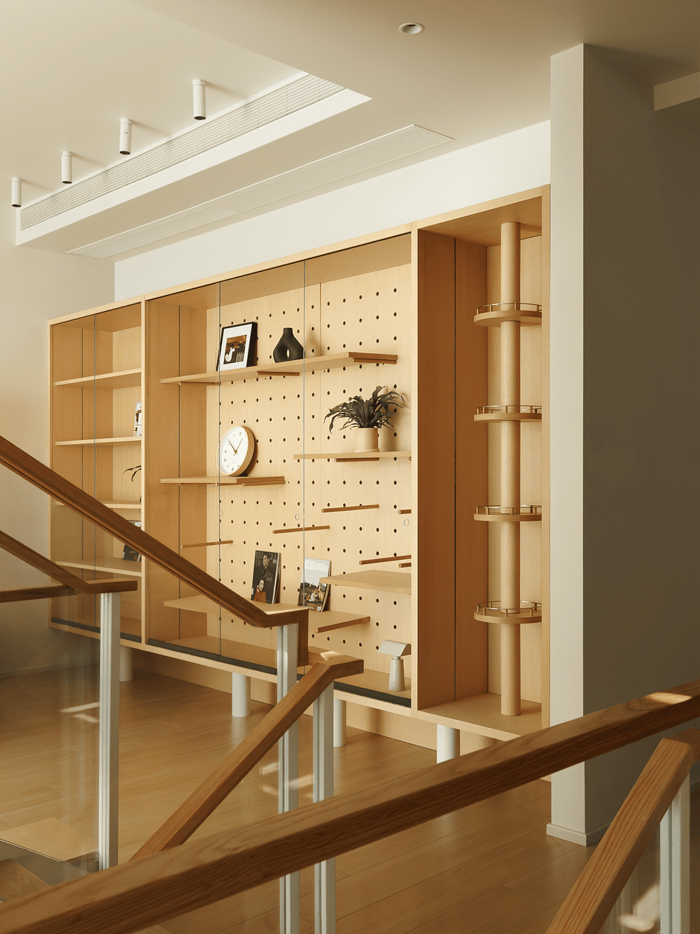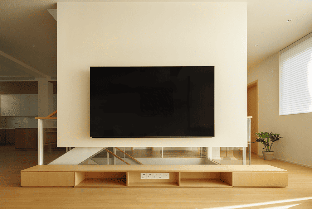 电视墙巧妙地悬挂于楼梯之上,既为楼梯与会客区提供了轻盈的双重遮挡,又保持了整体空间的开放与流动,避免了两个区域的直接曝光,营造出既通透又宁静的氛围。
