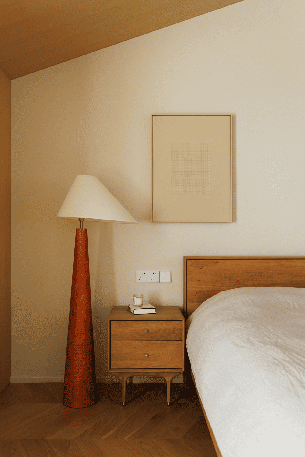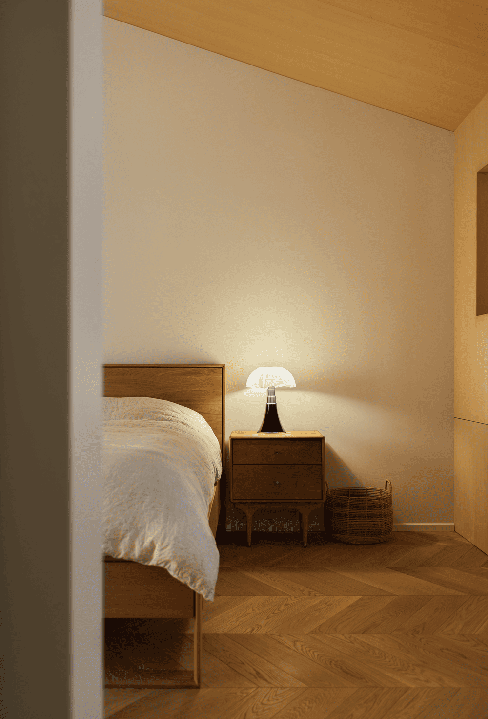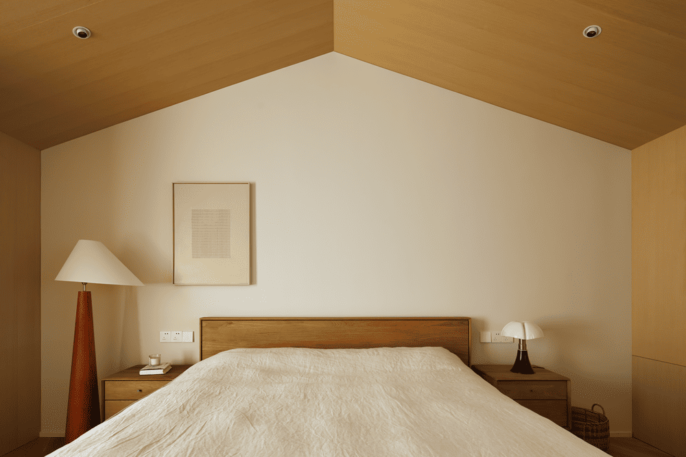 The third floor is the master bedroom suite, with an independent checkroom and bathroom to meet the owner's daily living needs. The sleeping area cleverly utilizes sloping ceilings, sloping beams and protruding walls, while the wood wrapping creates a warm and secure "house within a house". A desk is also set up in one corner of the bedroom for occasional work or reading.