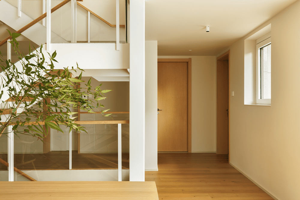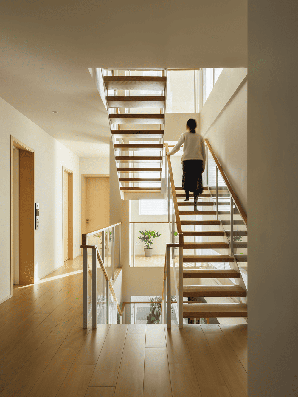 Starting from the "plant box", the staircase leads up to the parents' bedroom, kitchen, dining and meeting areas on the first floor.