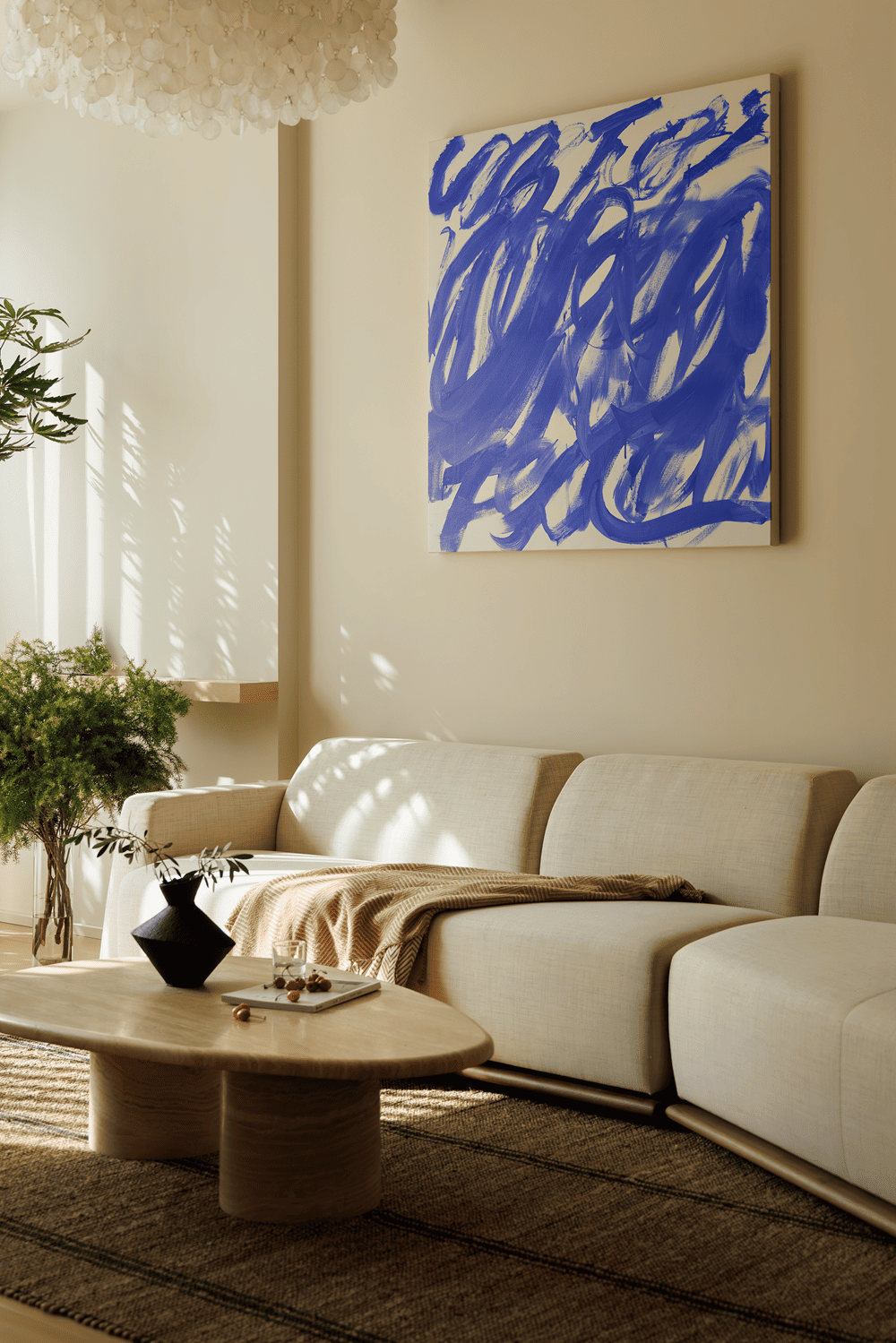位于楼梯一侧的会客区,光线充足且氛围柔和,以温馨的木色与米色作为基调。墙面上点缀的蓝色画作,以及Cassina品牌的红色Utrecht椅,成为了这一空间中的视觉亮点。墙角摆放的绿植,与室外的植物盒子及庭园遥相呼应,为室内增添了一抹自然的韵味。
